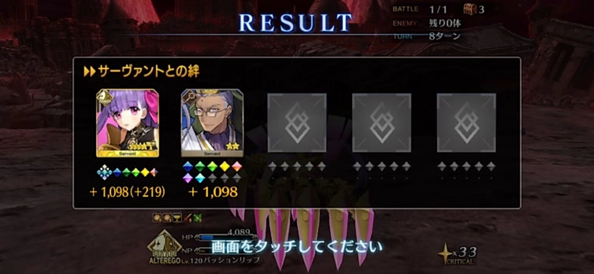 ・敵を倒して撃破ポイントを100にするとクリア。撃破ポイントは鯖のレア度が高いほど高くなる。
