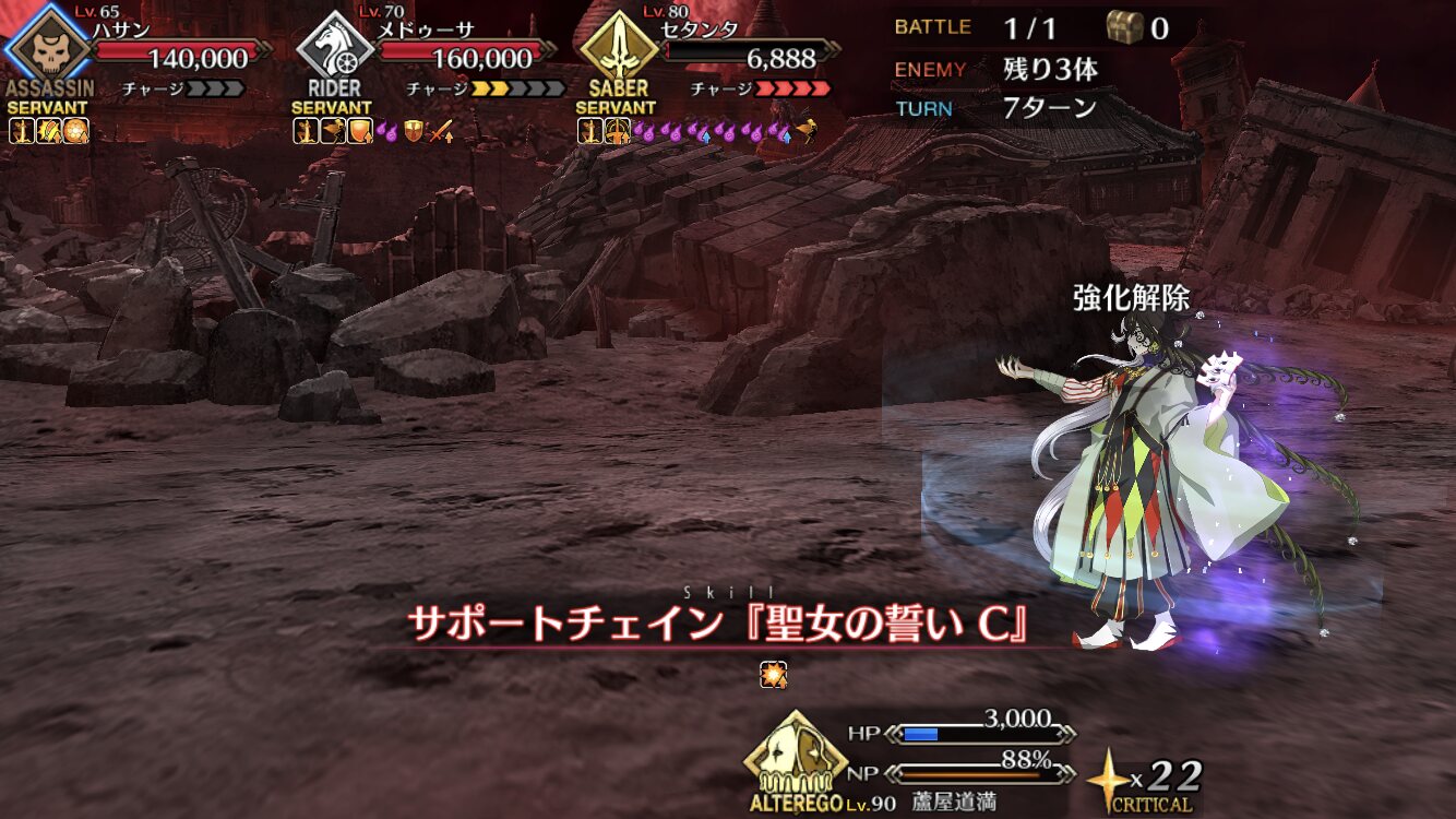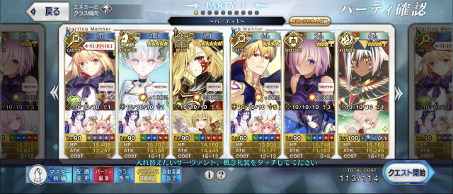 ・2ターンごとに「サポートチェイン」を発動される。その時表に出てない鯖のスキルを使用されるので、対策が必要。「魔眼A+」のスタンや「乗着EX」の無敵、「風除けの加護A」「カリュドーン狩りA」の回避状態の対策がいるだろう。