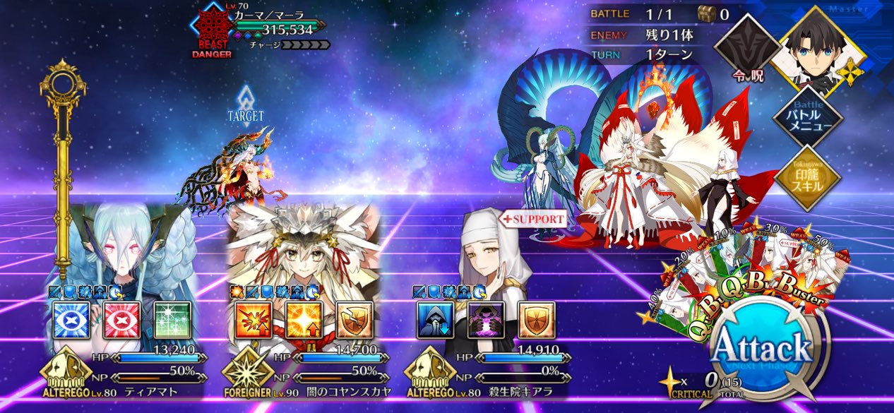 ティアマトマッマはNPチャージがS1の50%、S3の10%、キャストリアの30%、クラススキルの5%とキルケー礼装の4%で99%行くから絆6まで行ってなくても、90++を特攻礼装ドラコーとで5積み行けるのうれちい。