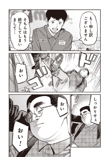 黒服の影が男に重なると同時に絶叫が響き渡り、黒服は何かを拾うように屈む。