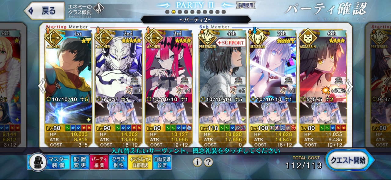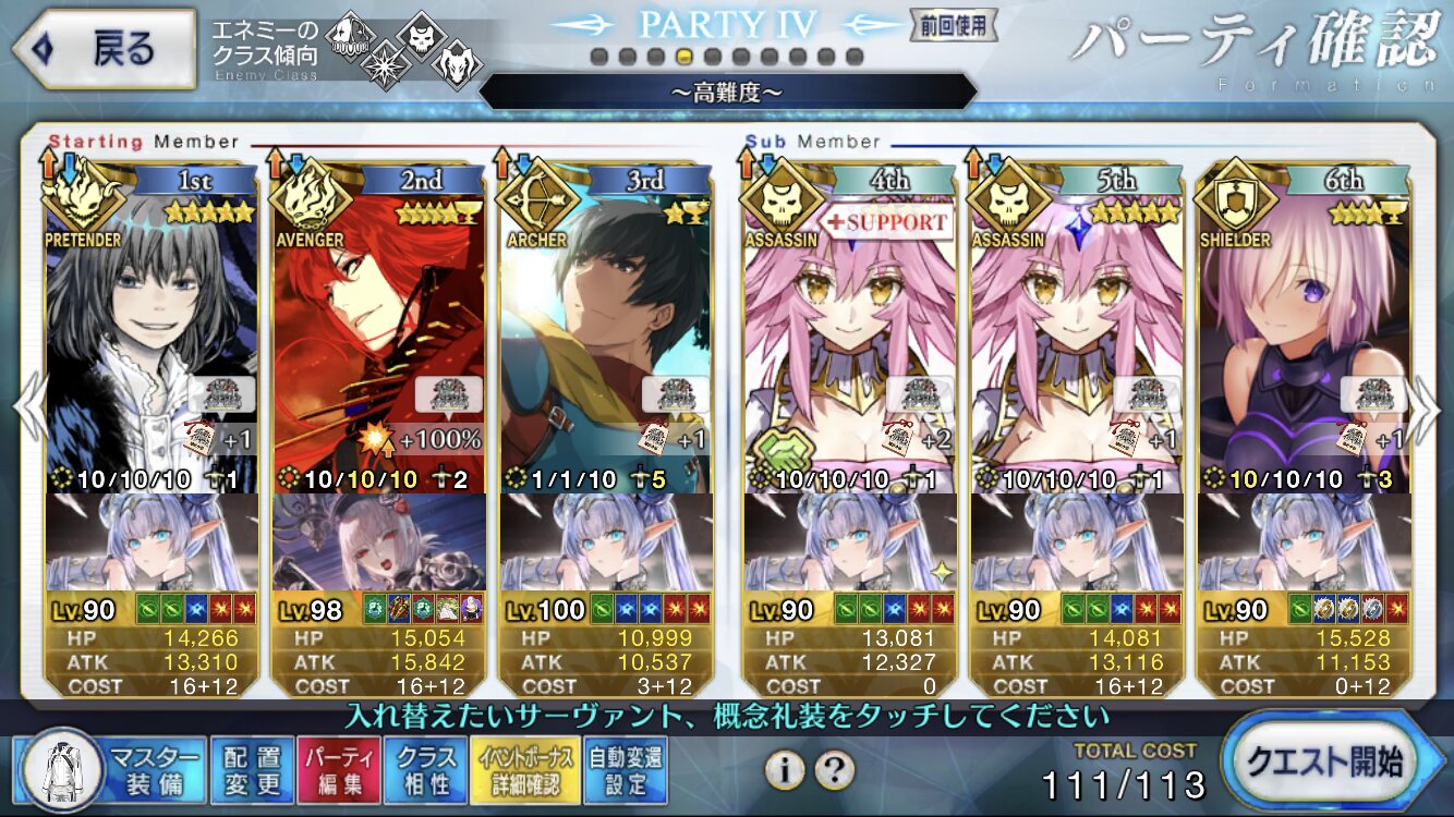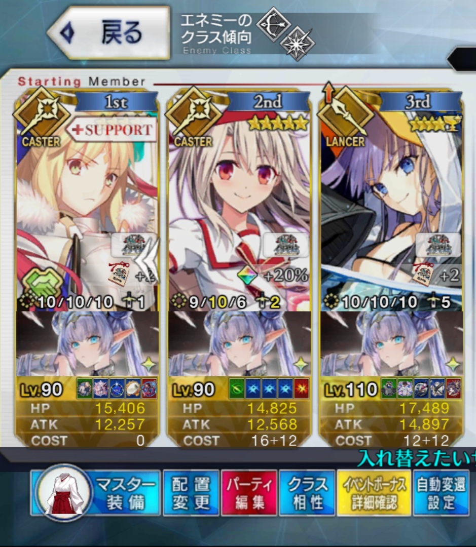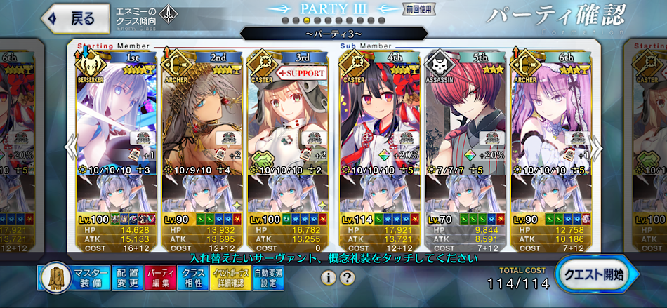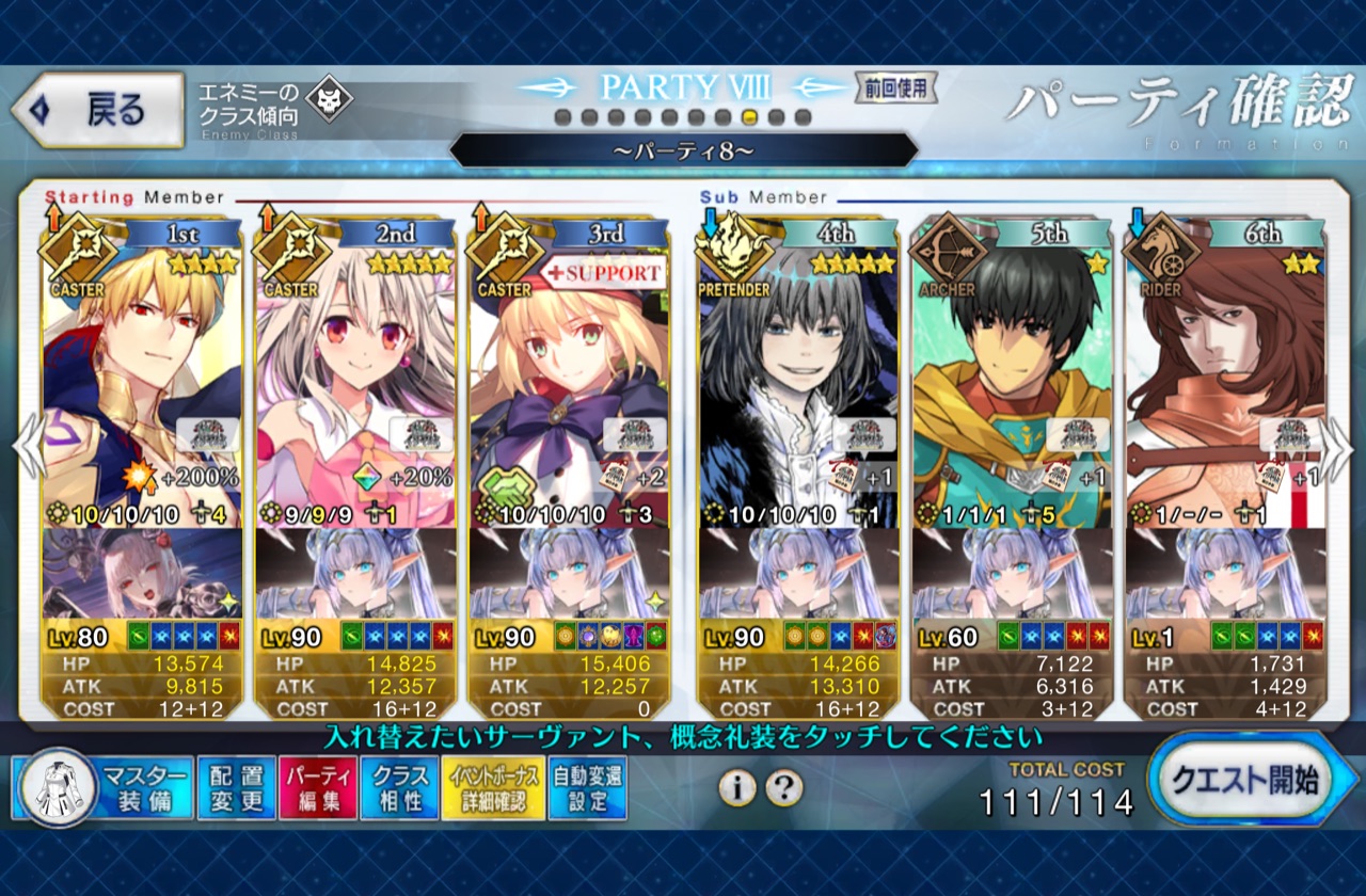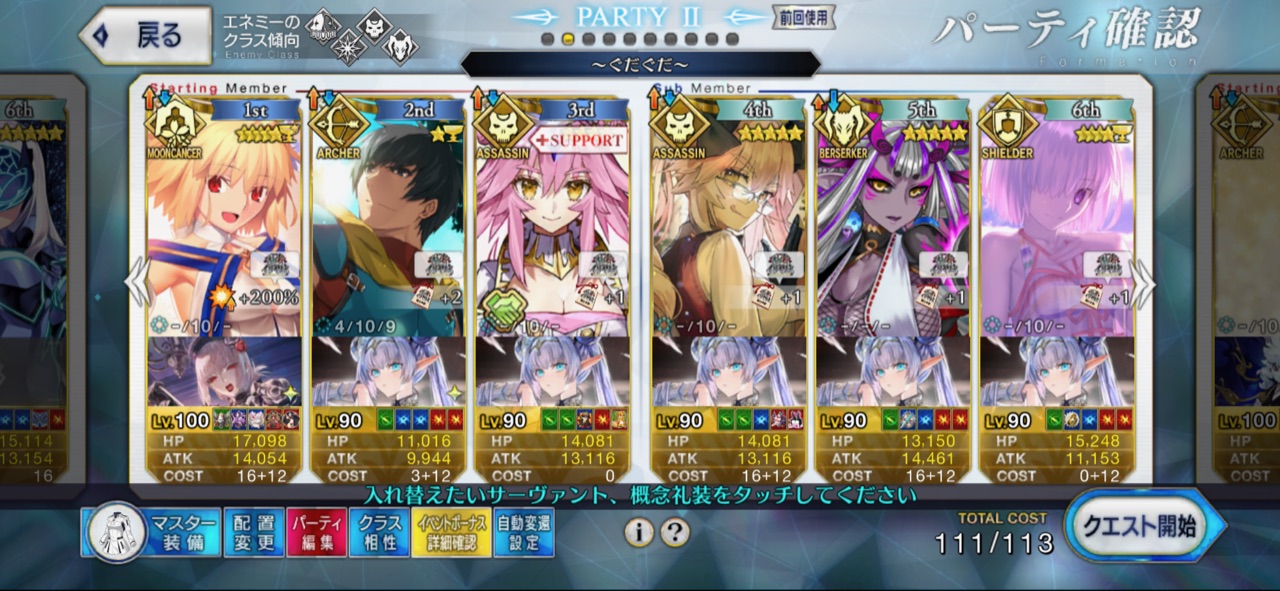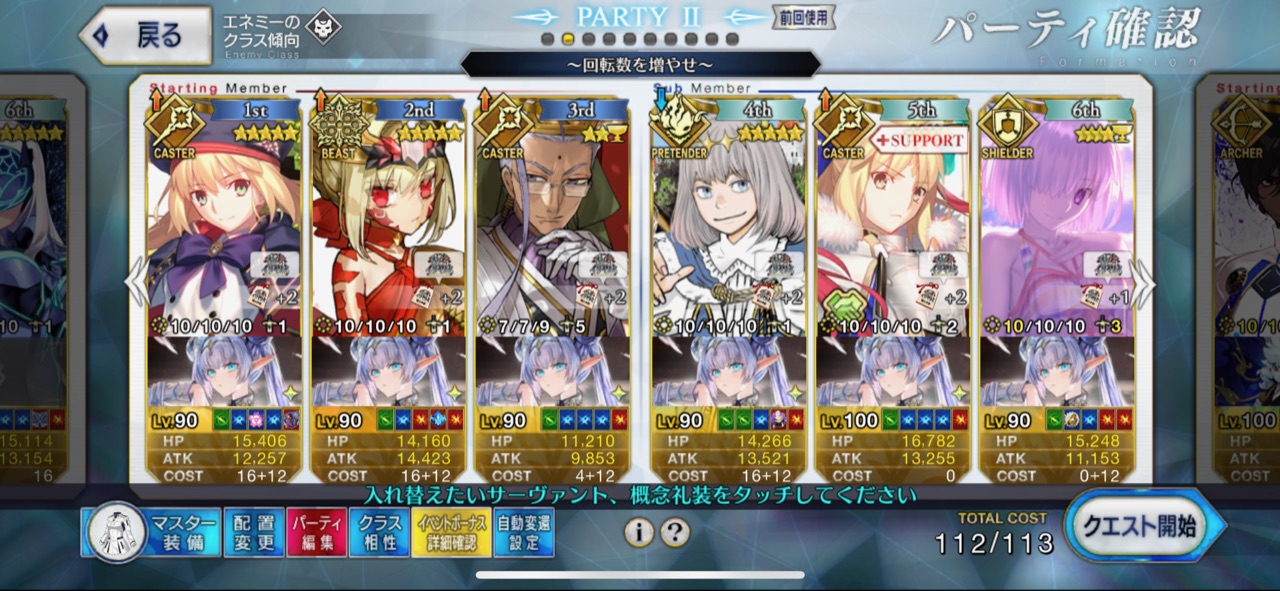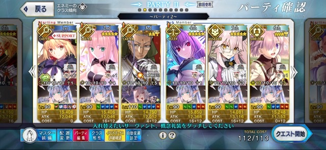 3wでちょっとだけNP足りないからマスター礼装で補助は必要90++6積みできたものの、素材が美味しくないので90+行きます。