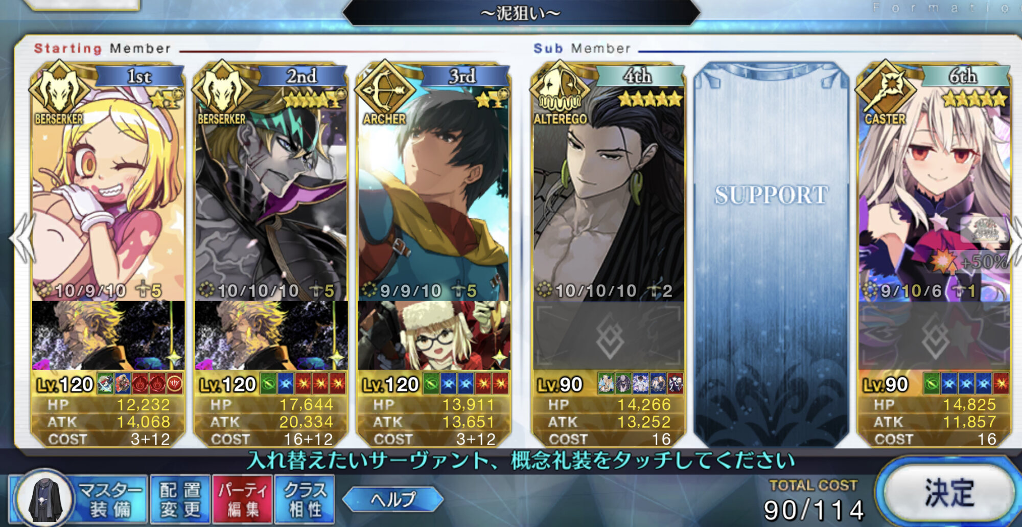 キャスギルは宝具5・銀フォウマ・Lv.100、凸泥礼装Lv.50、決戦制服