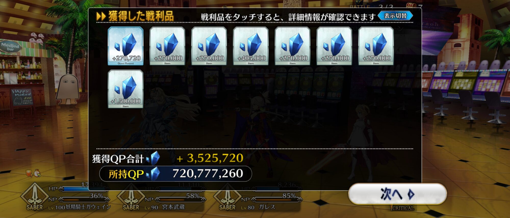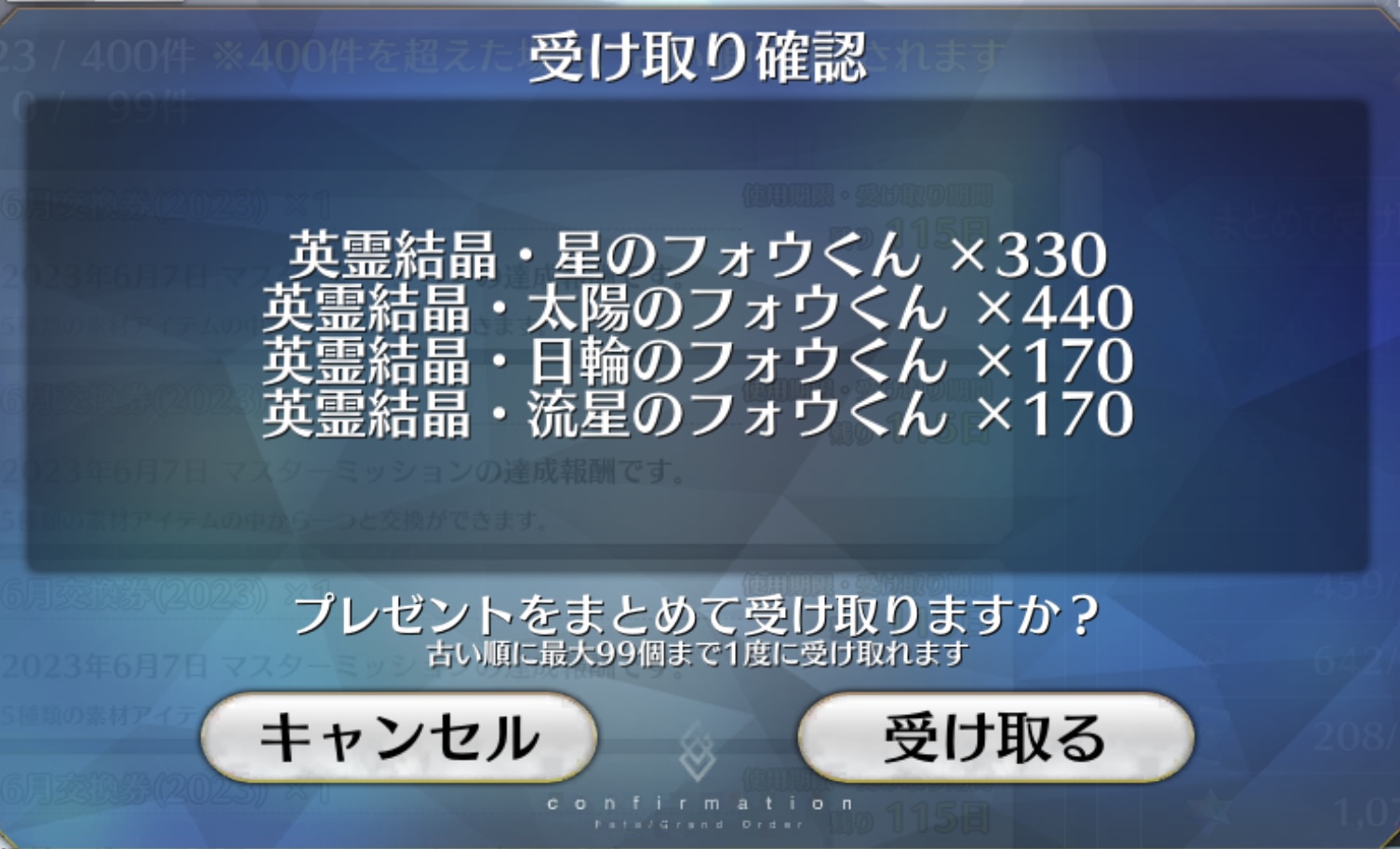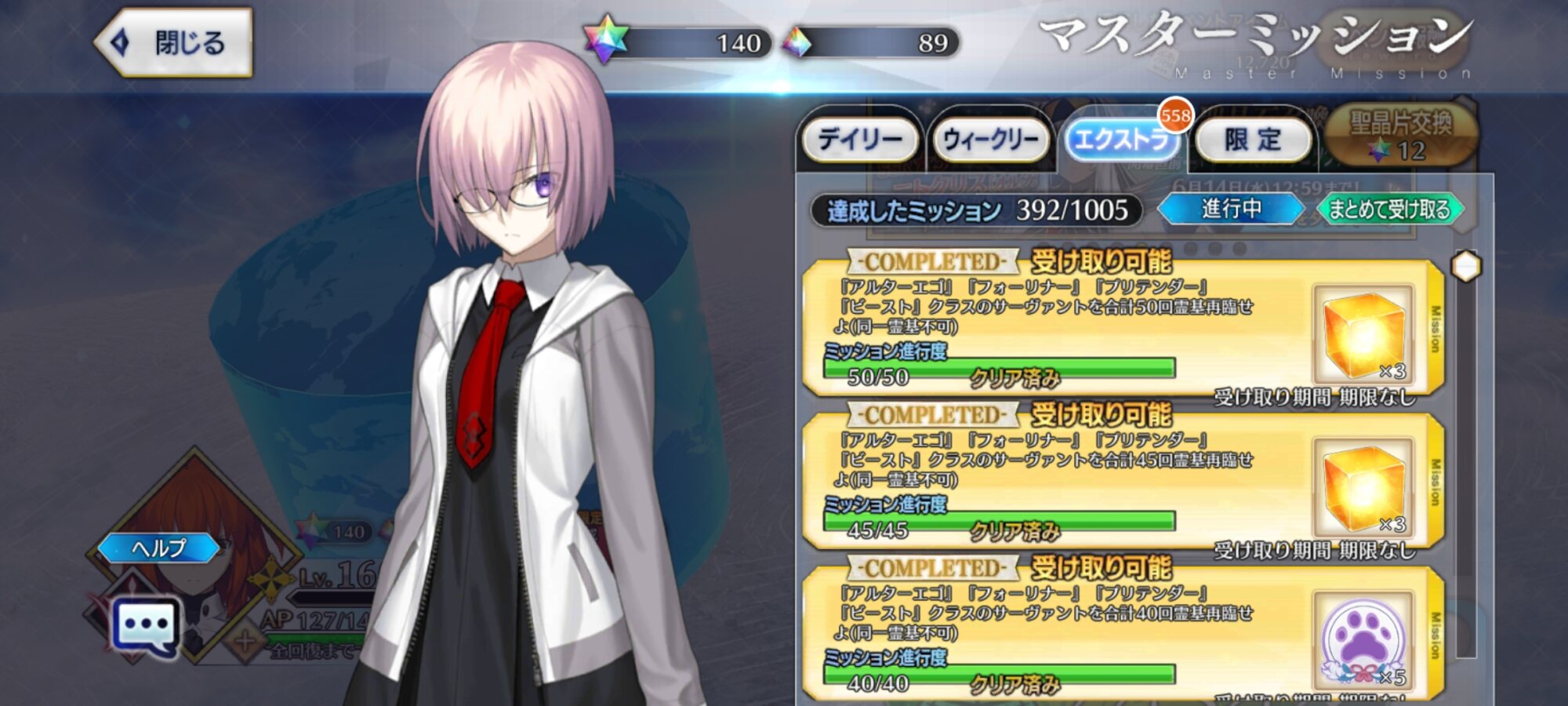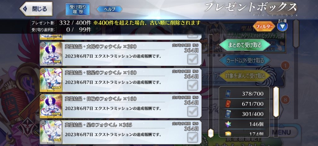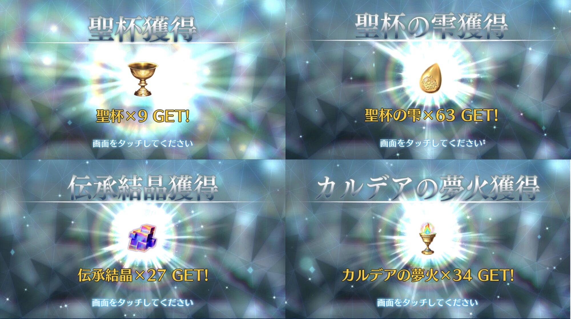 俺は石の数の方にビックリだよ聖杯9個と滴63個も貰っただが