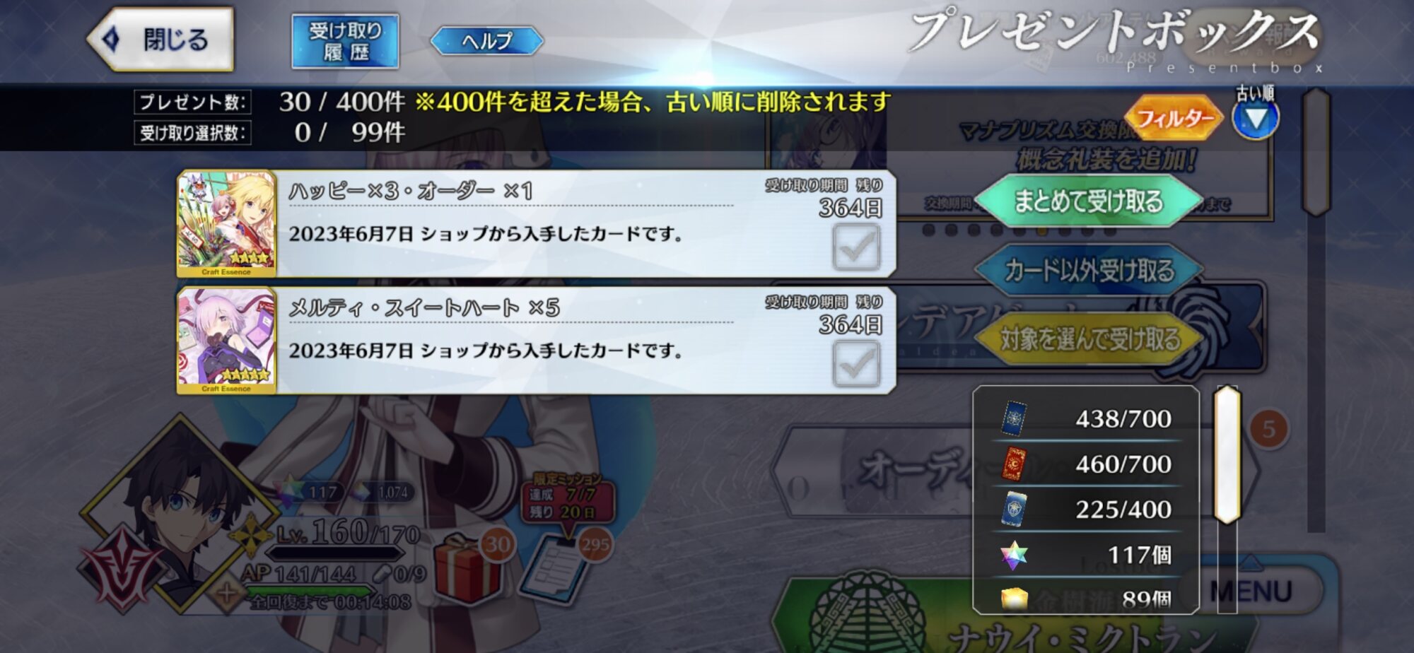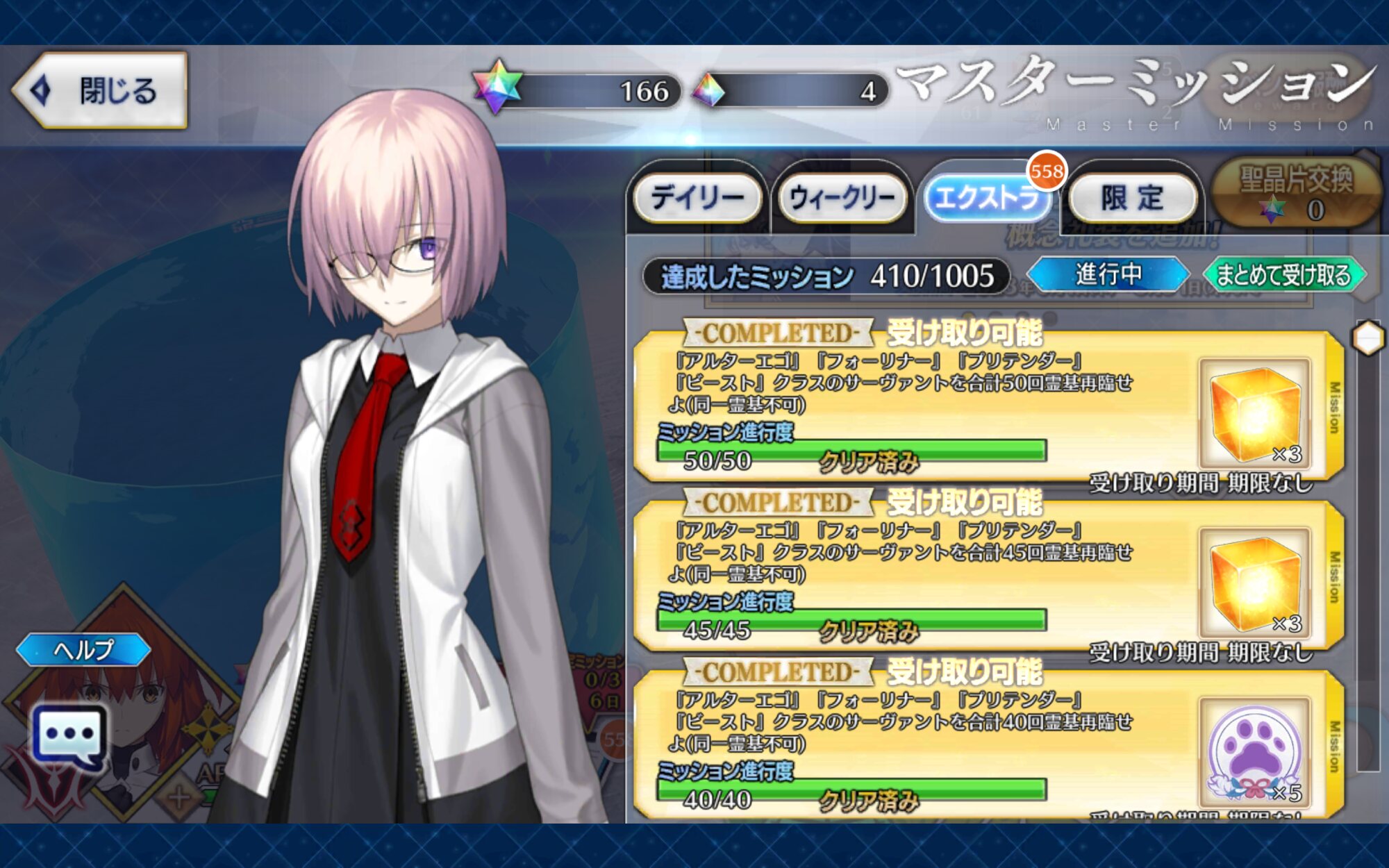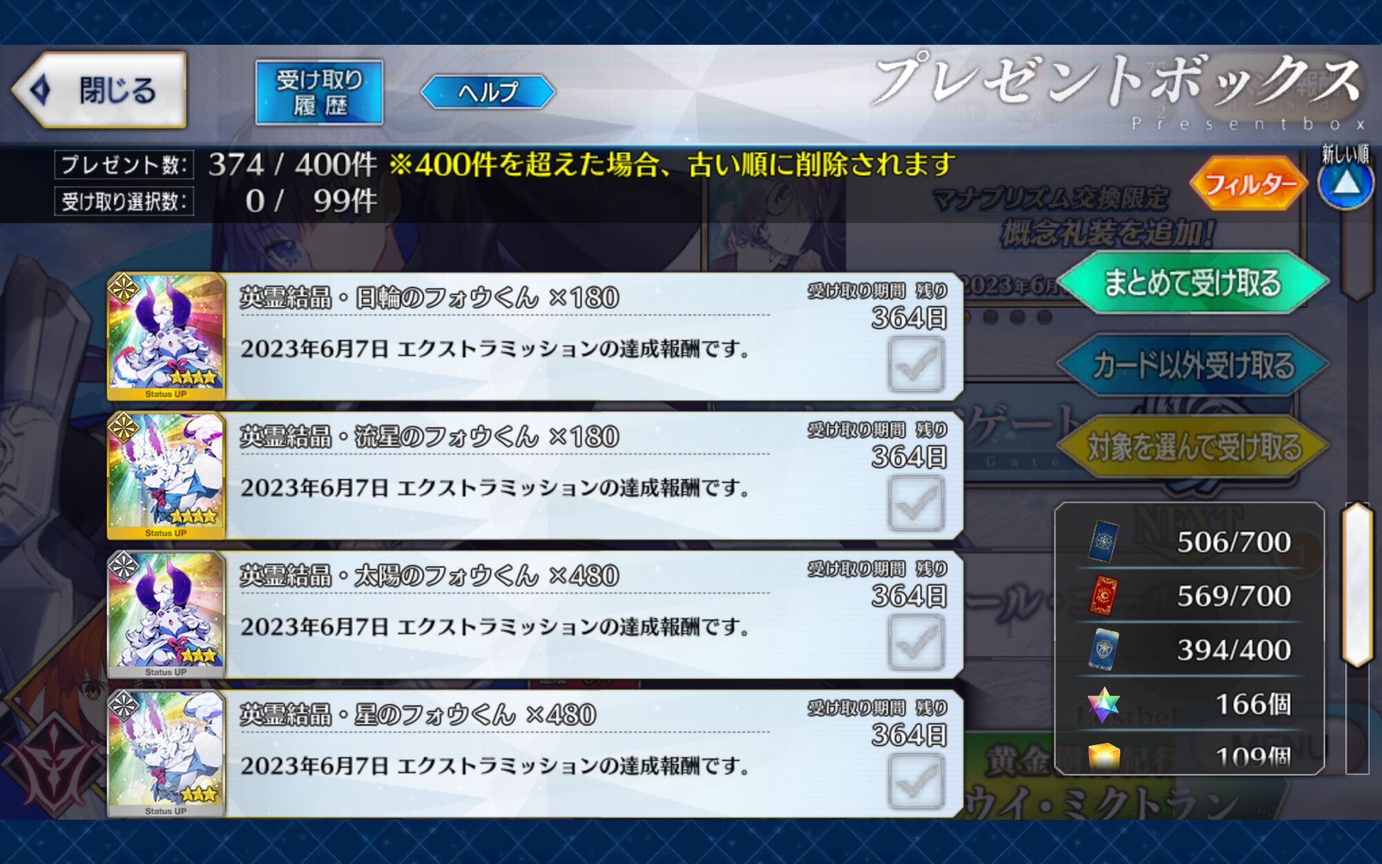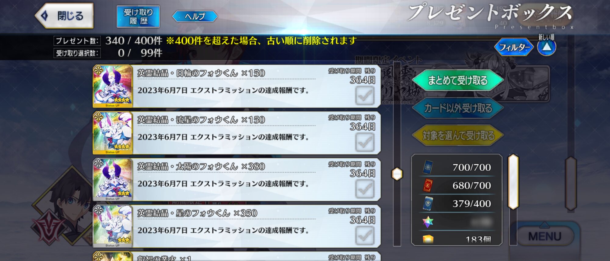 俺は石の数の方にビックリだよ聖杯9個と滴63個も貰っただが