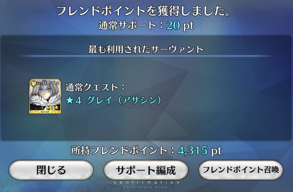 私はやっぱり宗一郎様が……とか言って、いつの間にかいなくなってそう。フレポは偏るよね。……ほんとに偏るよね……(イリヤ城のフレポはアンリがポンポン来てたのにハベにゃん1~2回くらいしか見てない気がしたし、リリィは7回くらい見た。何故。)
