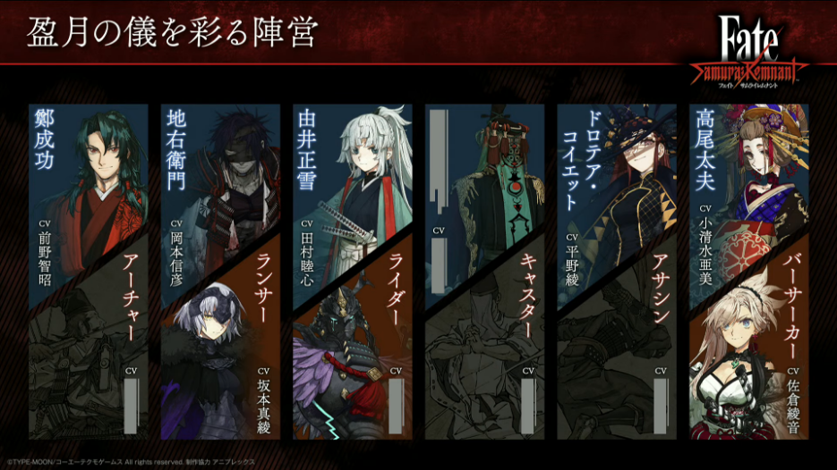 それが問題だこの中でアーチャーとアサシンがTMAで出ててキャスターがシルエットだけ出てるよな(痩躯の人物とのこと)