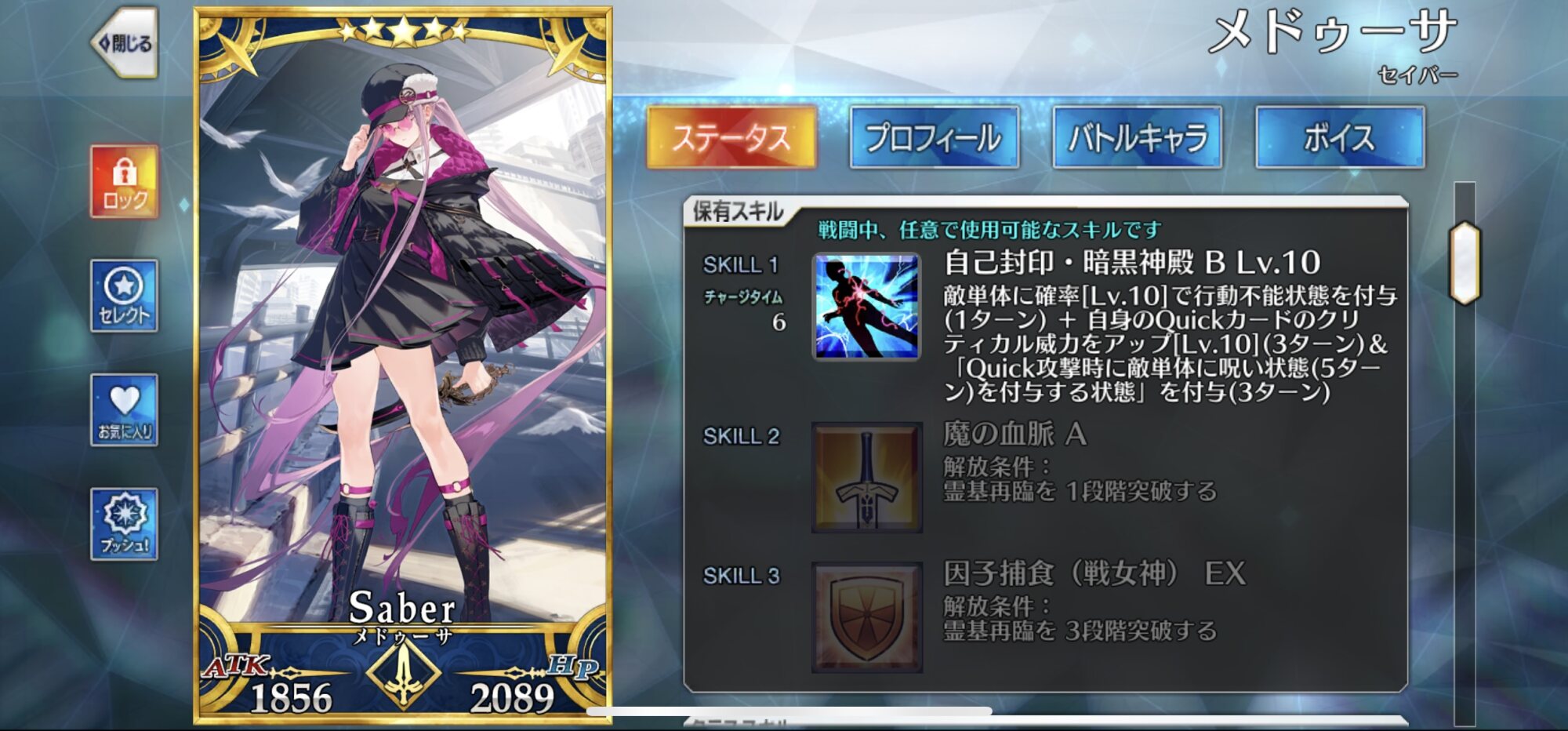 運命が言っているのですね・・マシュを褒めろと!!!メドゥーサ…第一印象から決めてましたな推し。Fate全然知らない時に見かけてデザインに惚れた。あと始めた時に最初の10連で来てくれたのは縁だと思う。剣についても語りたいけどイベントネタバレになるので割愛