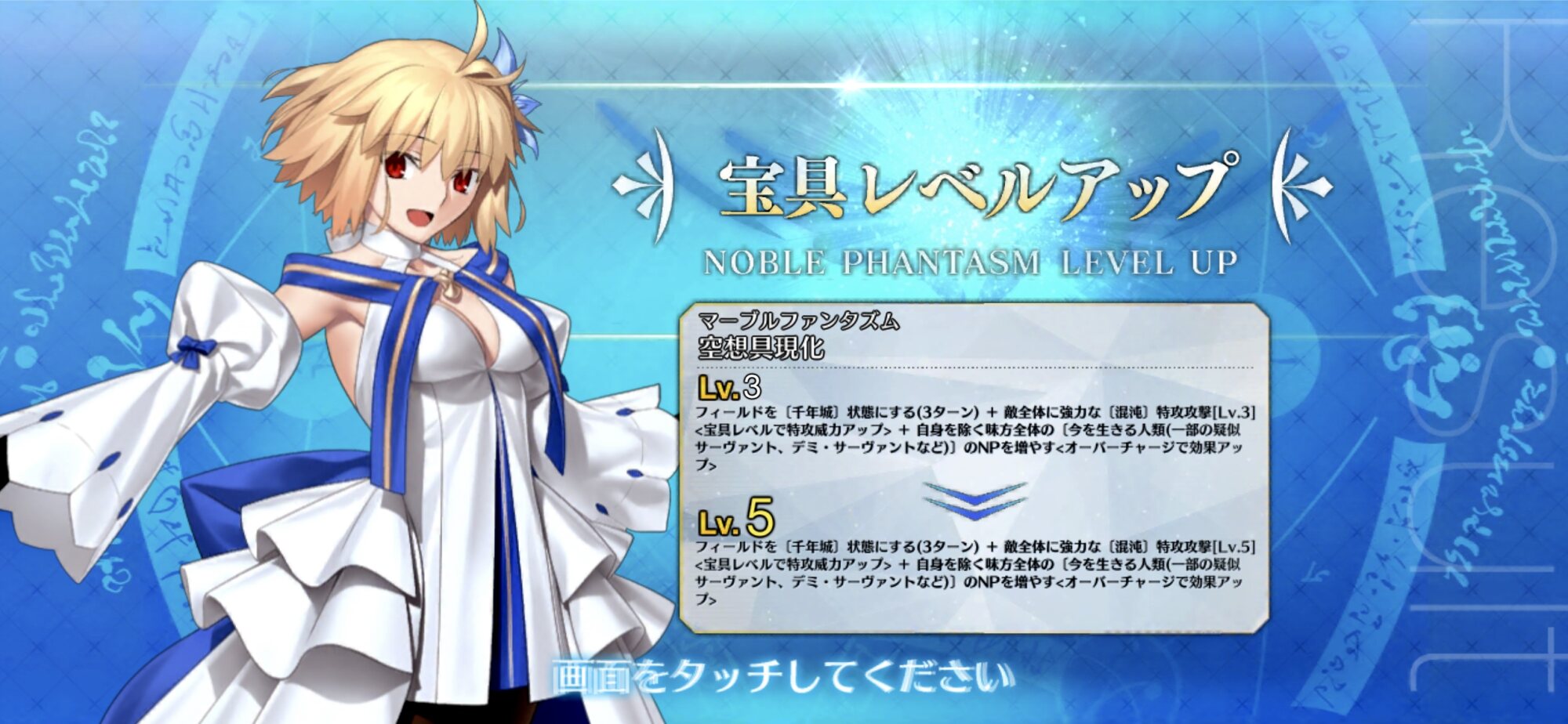 敵単体に超強力な〔人類の脅威〕特攻攻撃[Lv]<宝具レベルで特攻威力アップ>&味方全体に弱体無効状態を付与(1回・3ターン)<オーバーチャージで回数アップ>+宝具使用時のチャージ段階を1段階引き上げる状態を付与(1回・3ターン)
