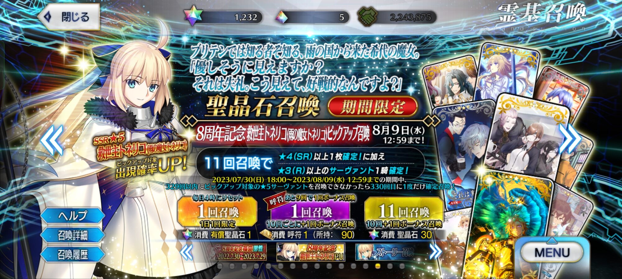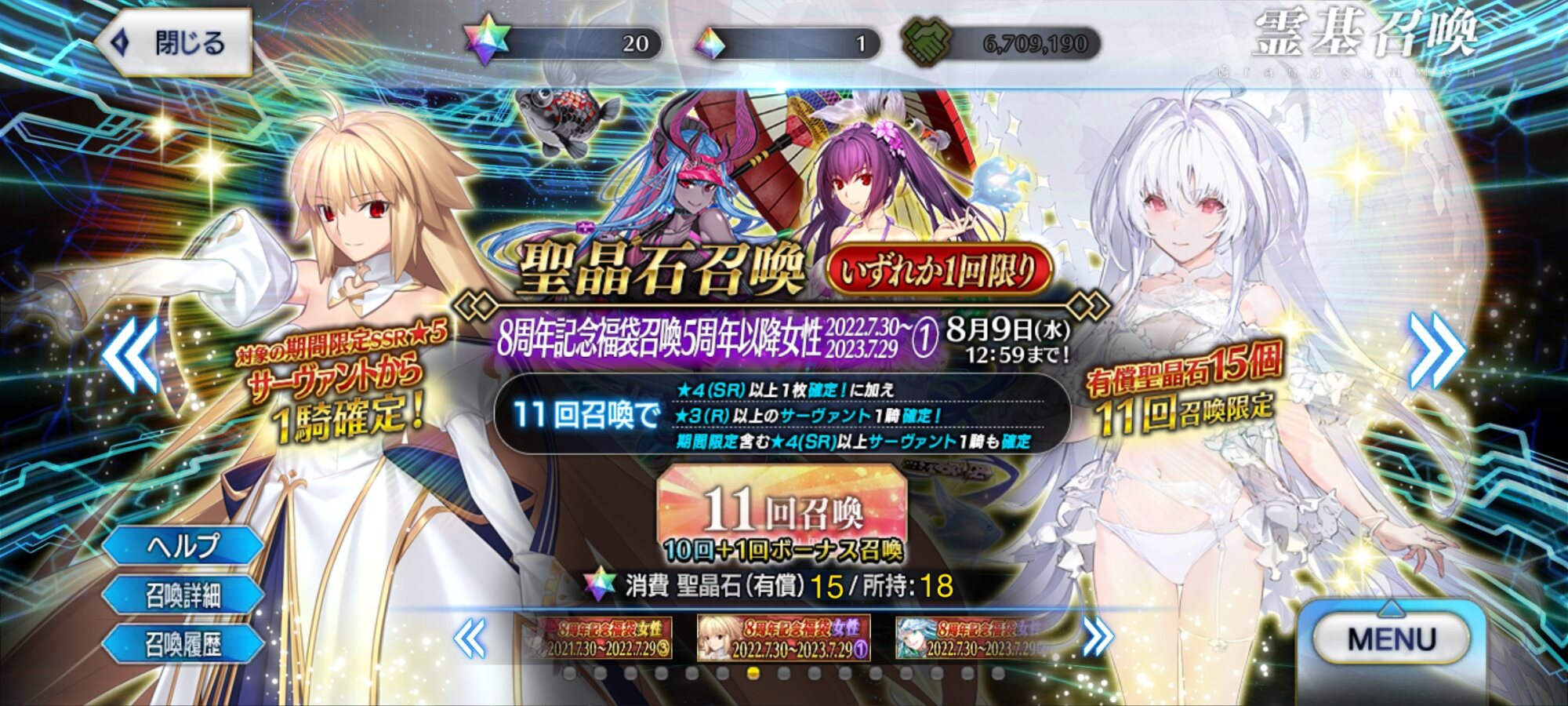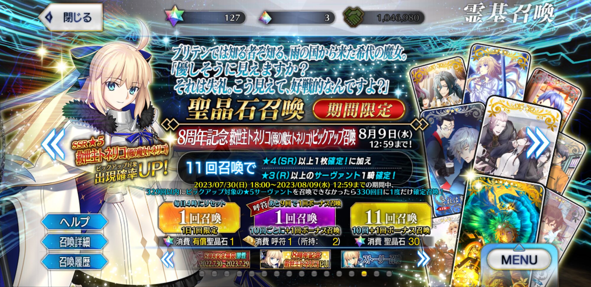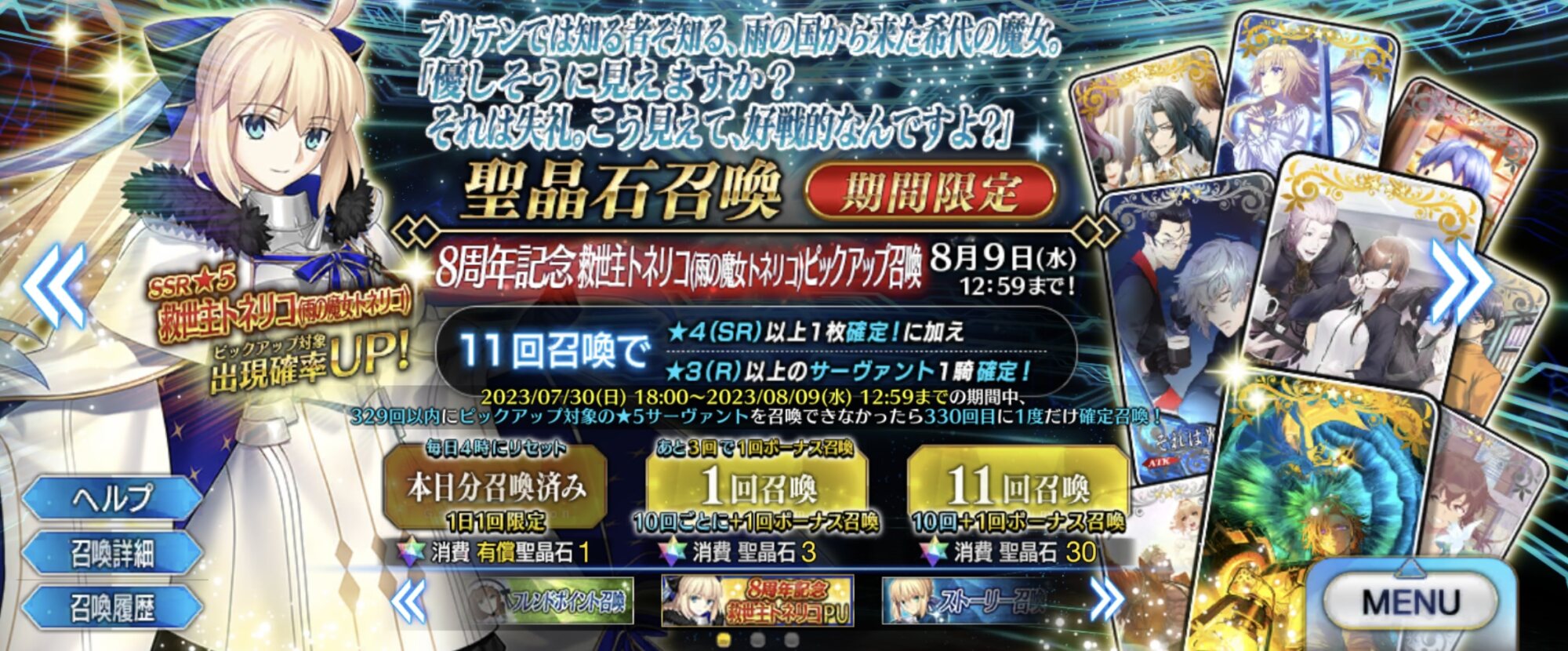 2日目:夏イベのシルエット3騎(妖精騎士?)、オベロン、周年トネリコ(水着モルガン)