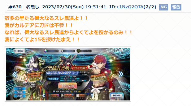 R18関連話題、よくてよ無しのガチャ結果、実装から二週間以内のシナリオ及び開催期間中のイベント内容、進行度依存の報酬、最終再臨や霊衣解放の画像や話題は専用スレにてお願いします。
