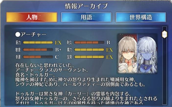 攻撃力カテゴリと考えると相当しっくりくる人ドゥルガーというかカーリーがダンスで世界破壊できるからな筋力EXなのはそういう理由だろう。