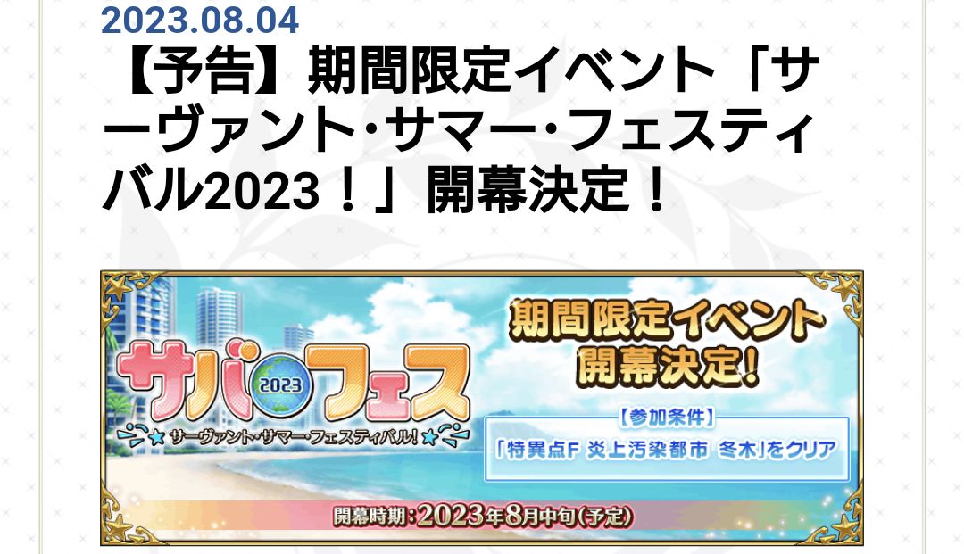 10スタートで期間3週間ならキリ良く8月で終わるね、期間1ヶ月あってもいいけれど実質水着とはいえトネリコさんおよび水妃モルガン陛下は周年サーヴァントなので、イベント実装サーヴァントの出番をそれほど食うことはないと思ってる