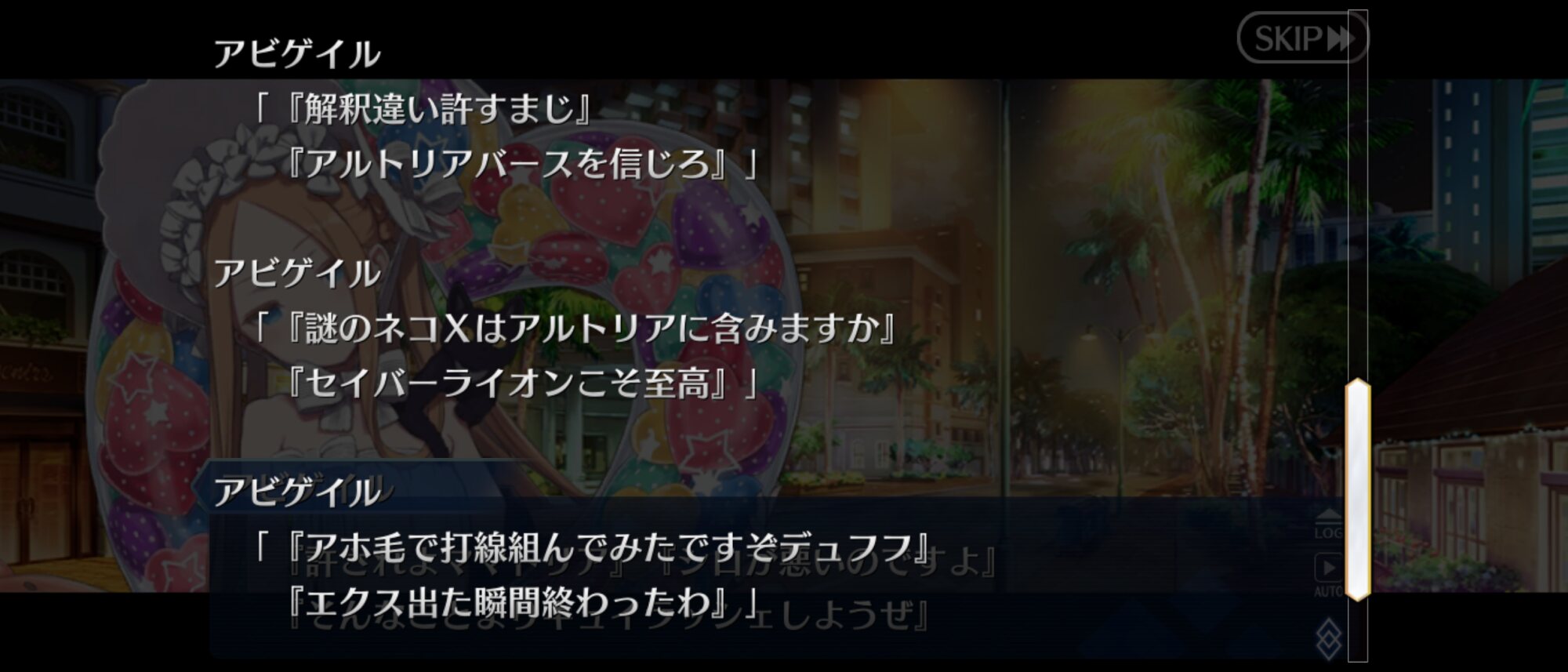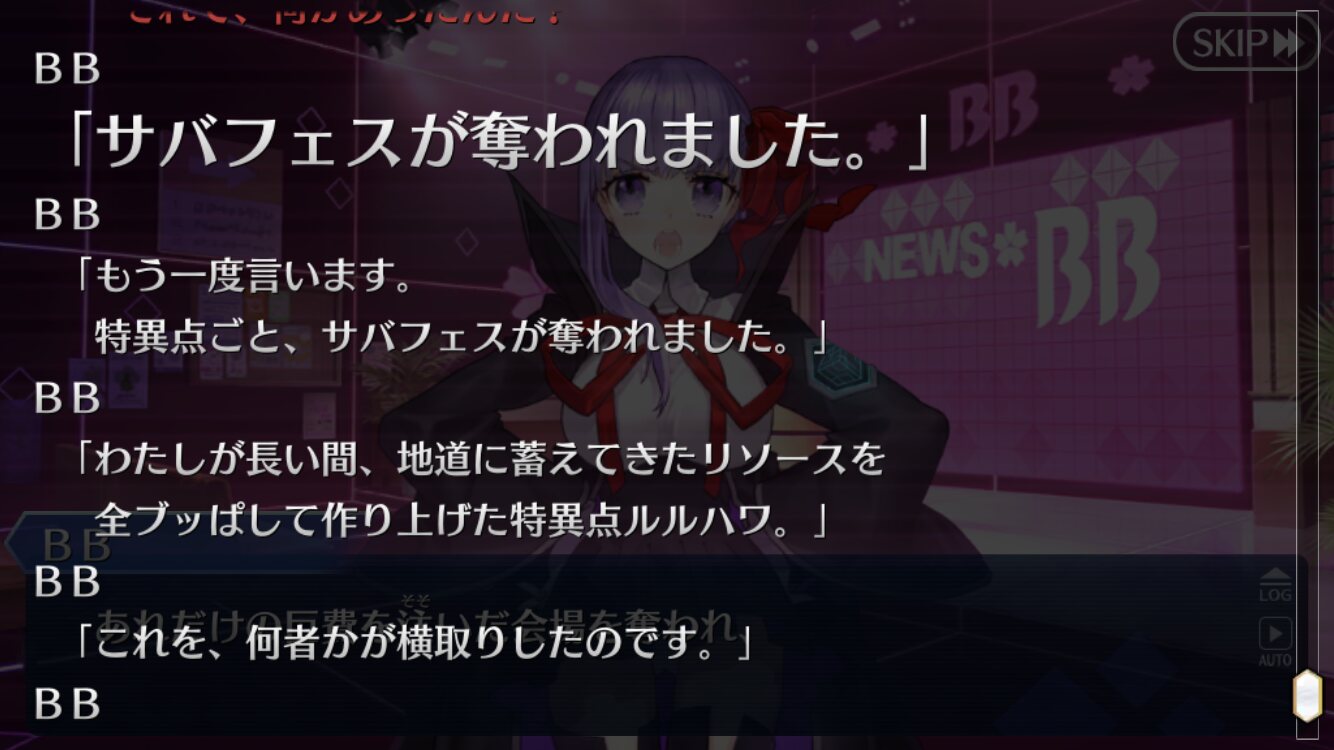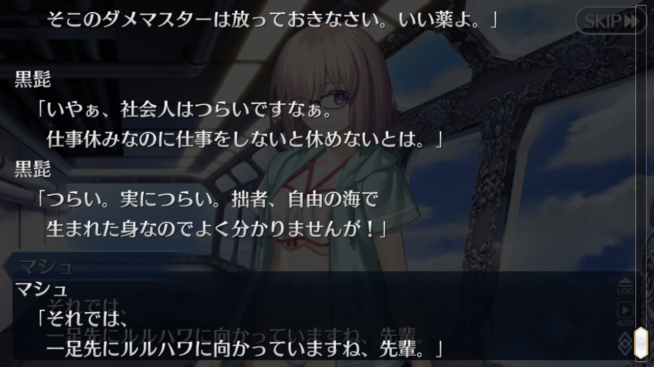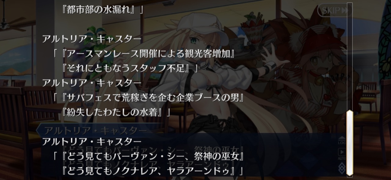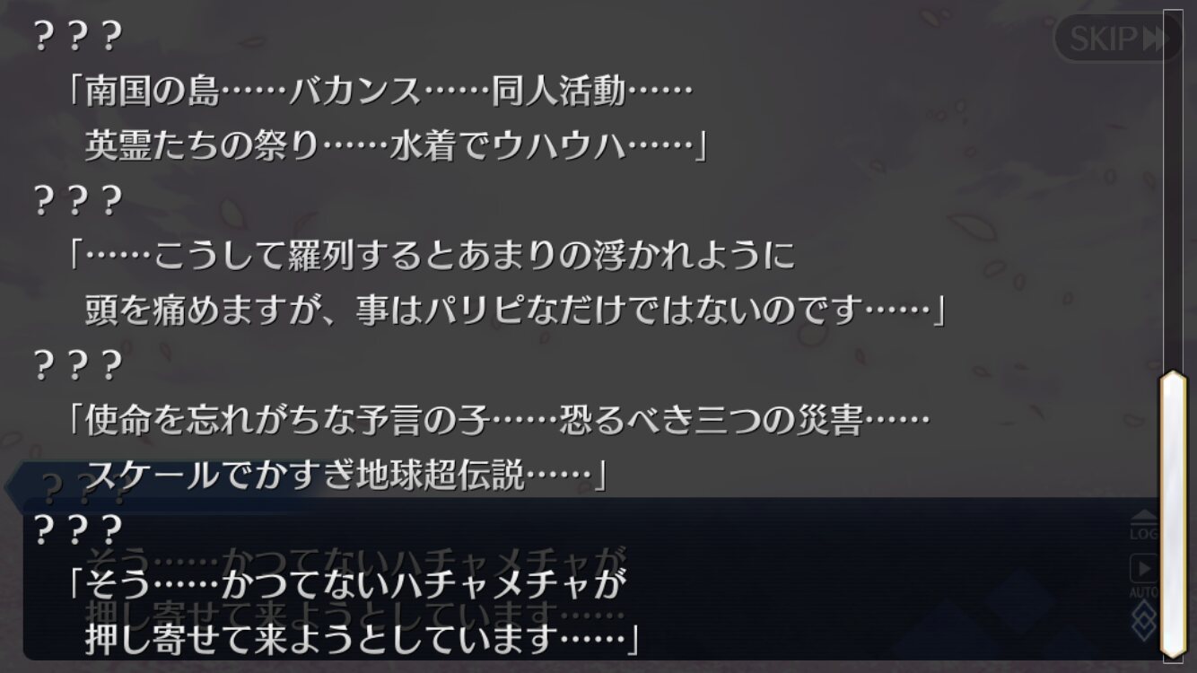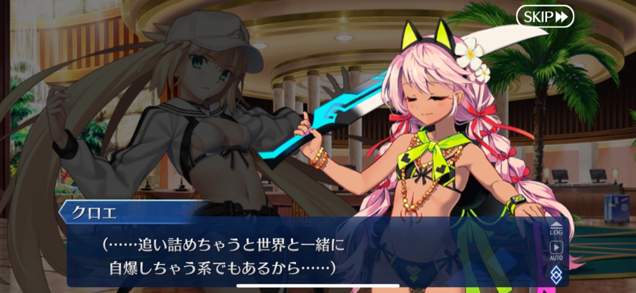 これ以上ガッツリネタバレあるとすれば、それこそオーロラ様実装とかになるかな?ホロウみたいな感じで、サバフェスでわちゃわちゃしつつ、芯は英雄トネリコを軸とした2部6章の後始末的な内容になると嬉しい