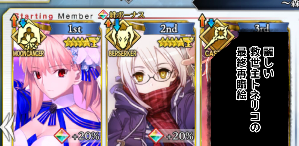 まあセイバー、というか妖精騎士たちに有利取れるクラスではあった……立て乙。コロコロクラス変わるからアルターエゴみたいな感じになると思ったんだ。まさかあんな事になるとは。