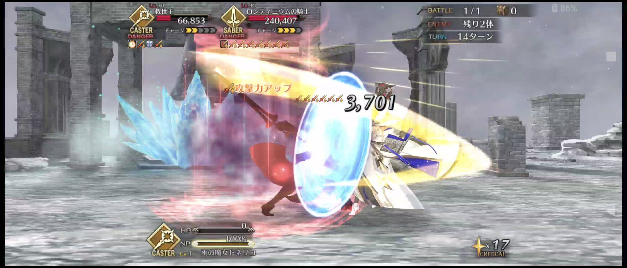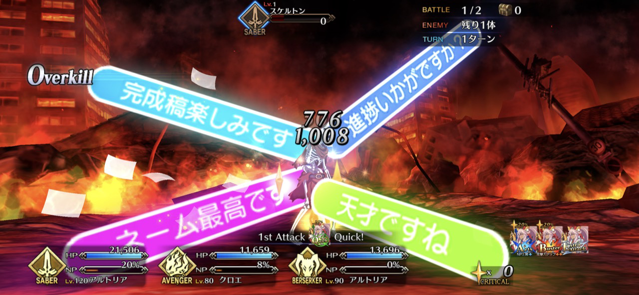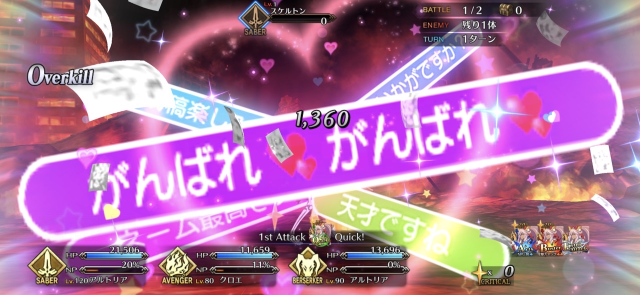 1wでなんやかんやしてnp100にしてocでクロ呼び出せば3連射も行けますWクロエのお陰でアルクェイド連射が簡単にできるようになったぜ