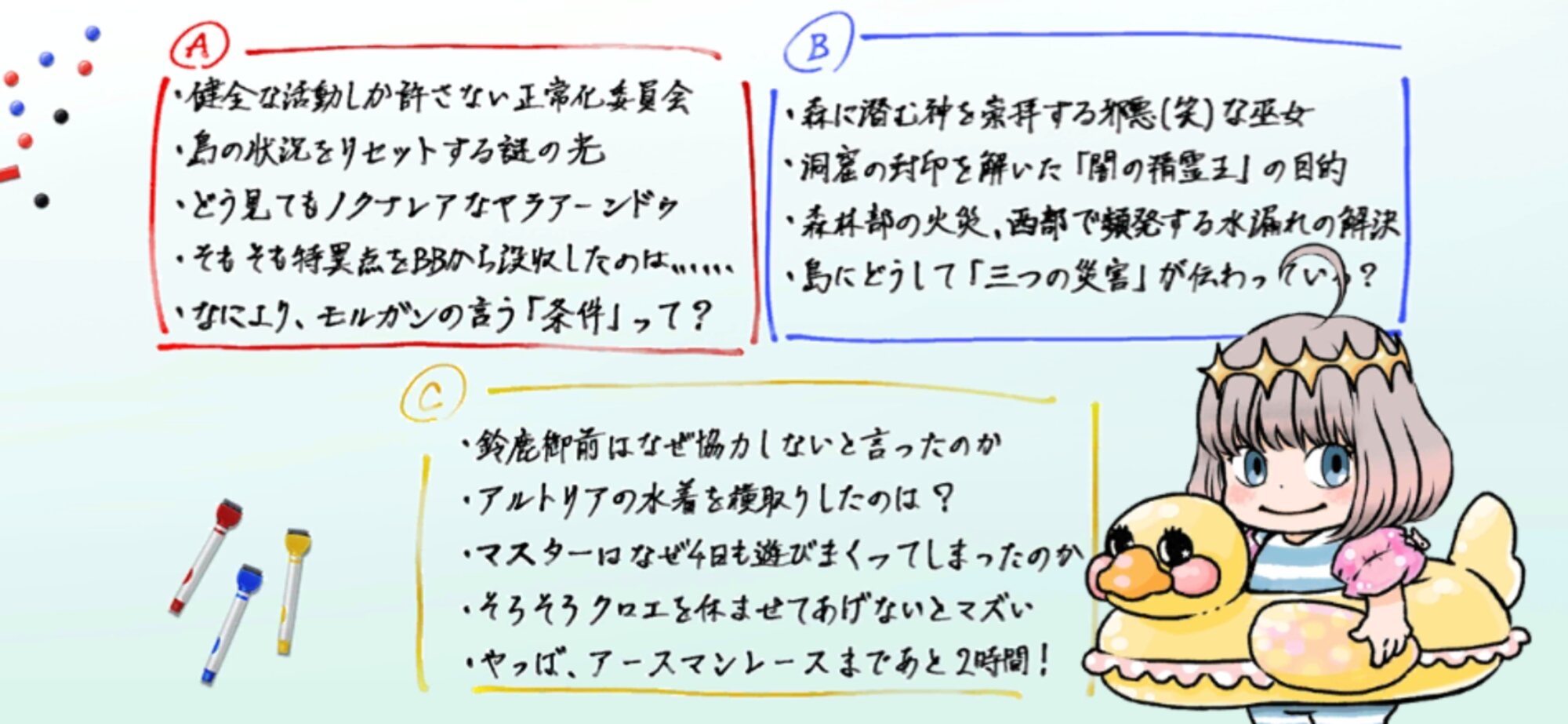 これいつもなら夏に浮かれまくってみょうちきりんなエネミー名になるサーヴァントたちがリセットされたくなくて試行錯誤してるせいで完全に夏を楽しみきれてません、ってことだったりする…?>>72完全に少女の癇癪だよねこれ。冬の女王からいきなり中身の少女が顔を出すのはズルいと思います