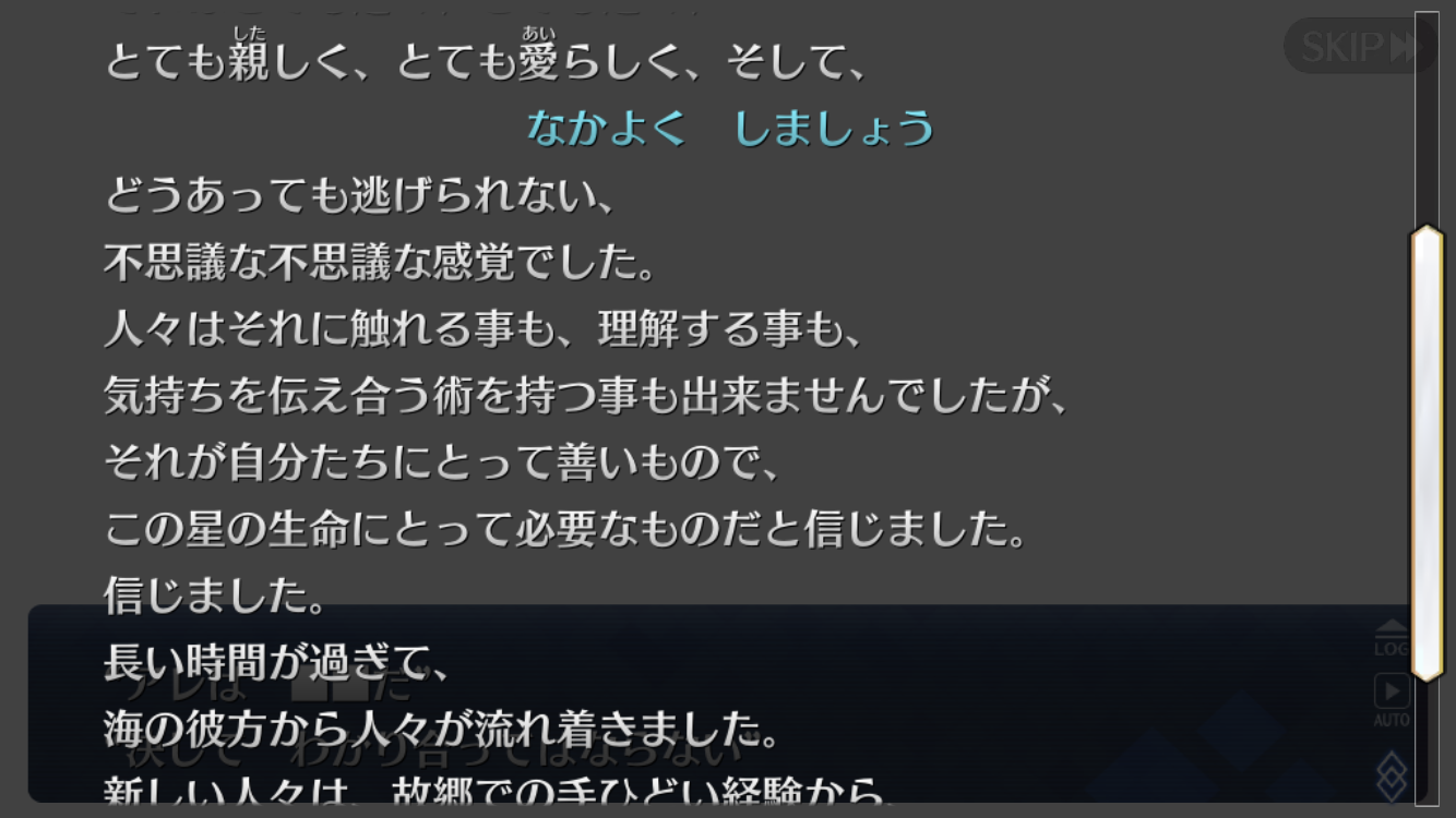・「仲良く(ひとつ)」という表示からするに吸収・融合によって物理的な同一化による和平が最終目的か?(海外から来た人々が怪物性を強調していた。)
