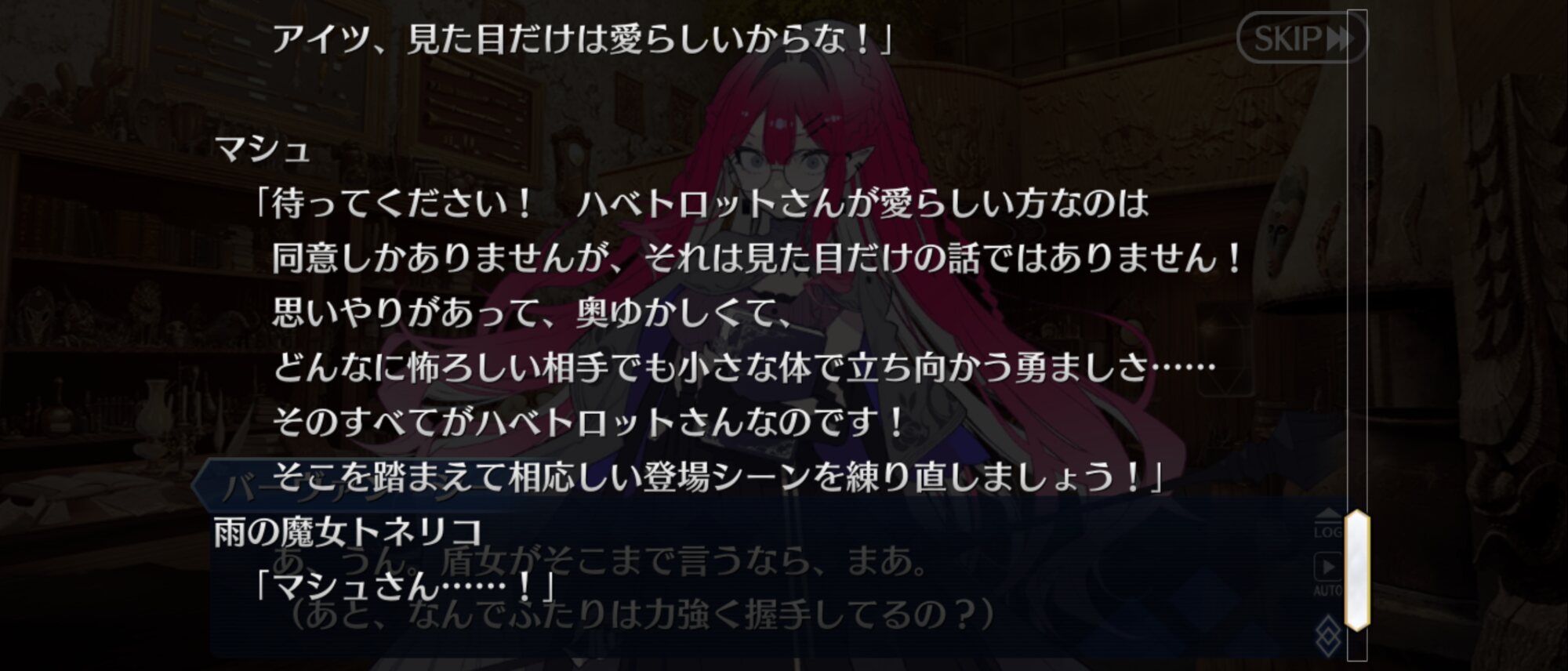 最高だったよ!ありがとう!どうかこの余所見してたらバフの瞬間を見過ごした愚かなマスターに、壁画を描くためにミコケルに会いに行った時どんな台詞でバフがかけられたか教えてもらえないだろうか………
