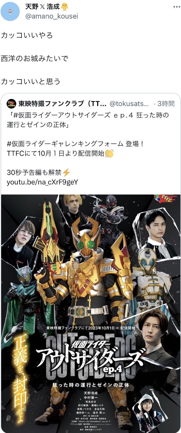格付けチェックがバラエティのコーナーから一つの特別番組に格上げされたみたいに、今は「普通はジャマトvs仮面ライダーの企画番組だけど、好評のため今季は特別スペシャルでライダーバトルロワイヤルをお送りします」みたいな感じじゃないかなん、あれ?そういや今年はライダー冬映画やんの?