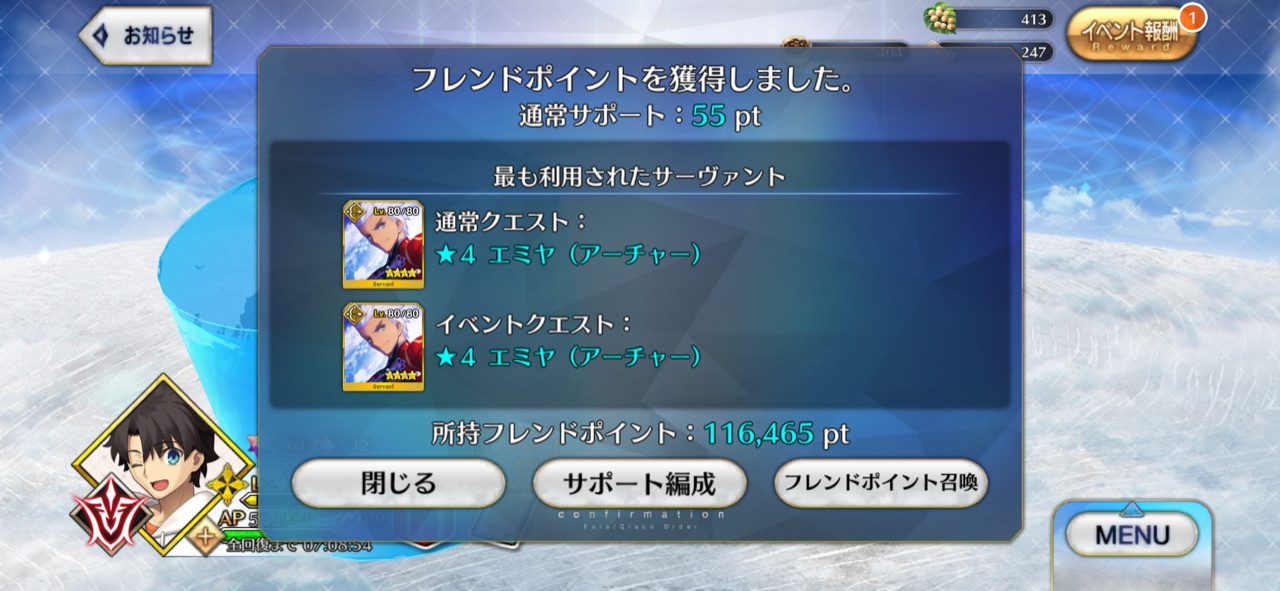その当時はまだやってなかったから単純に楽に周回できる戦力が自分になかっただけとかかなそういえば最近経験値礼装来ないからフレポ貯まりまくってるな