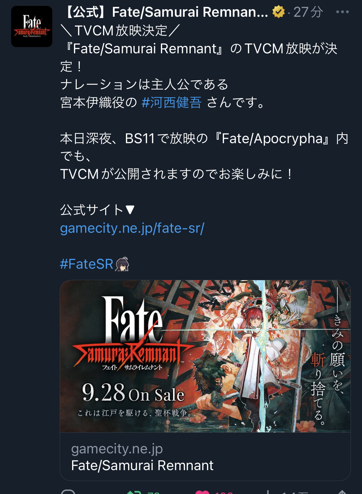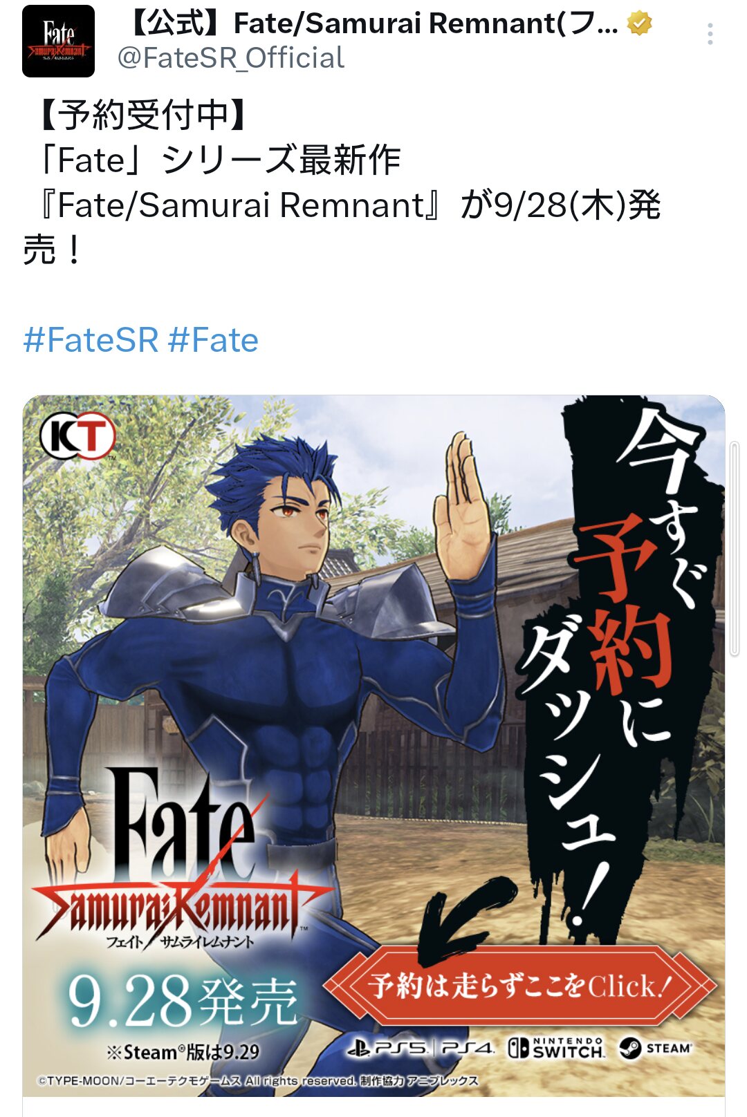 コーエーテクモゲームス開発、Fateシリーズ新作ゲーム『Fate/Samurai Remnant』について語るスレです