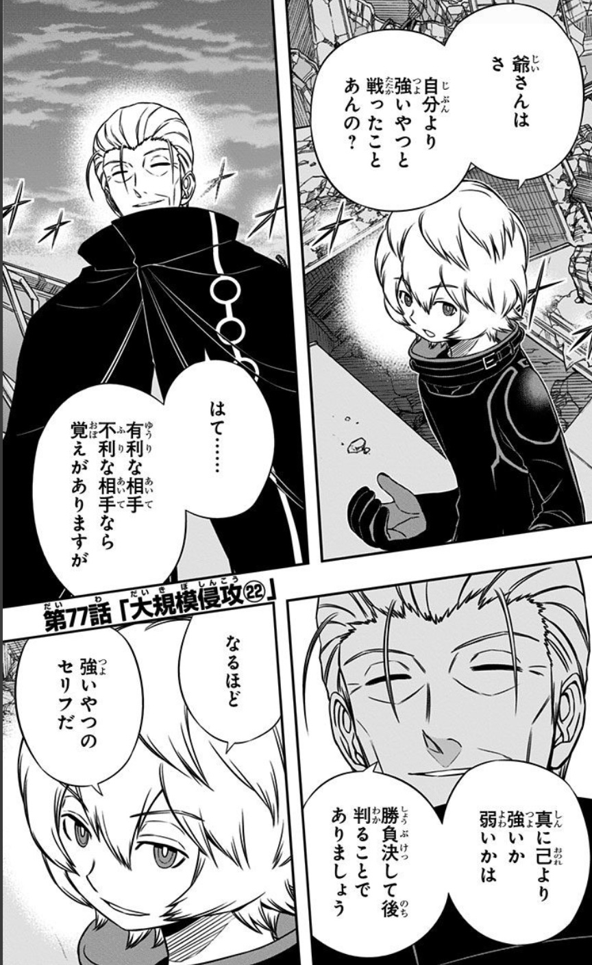 老いたる土方歳三って設定には驚いたし、土方歳三ファンとしては心踊る思いだった。ワートリの単純に強い要素ばかり組み合わせてる最強おじいちゃんは勘弁して