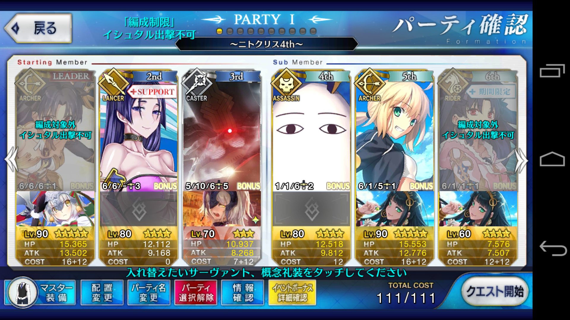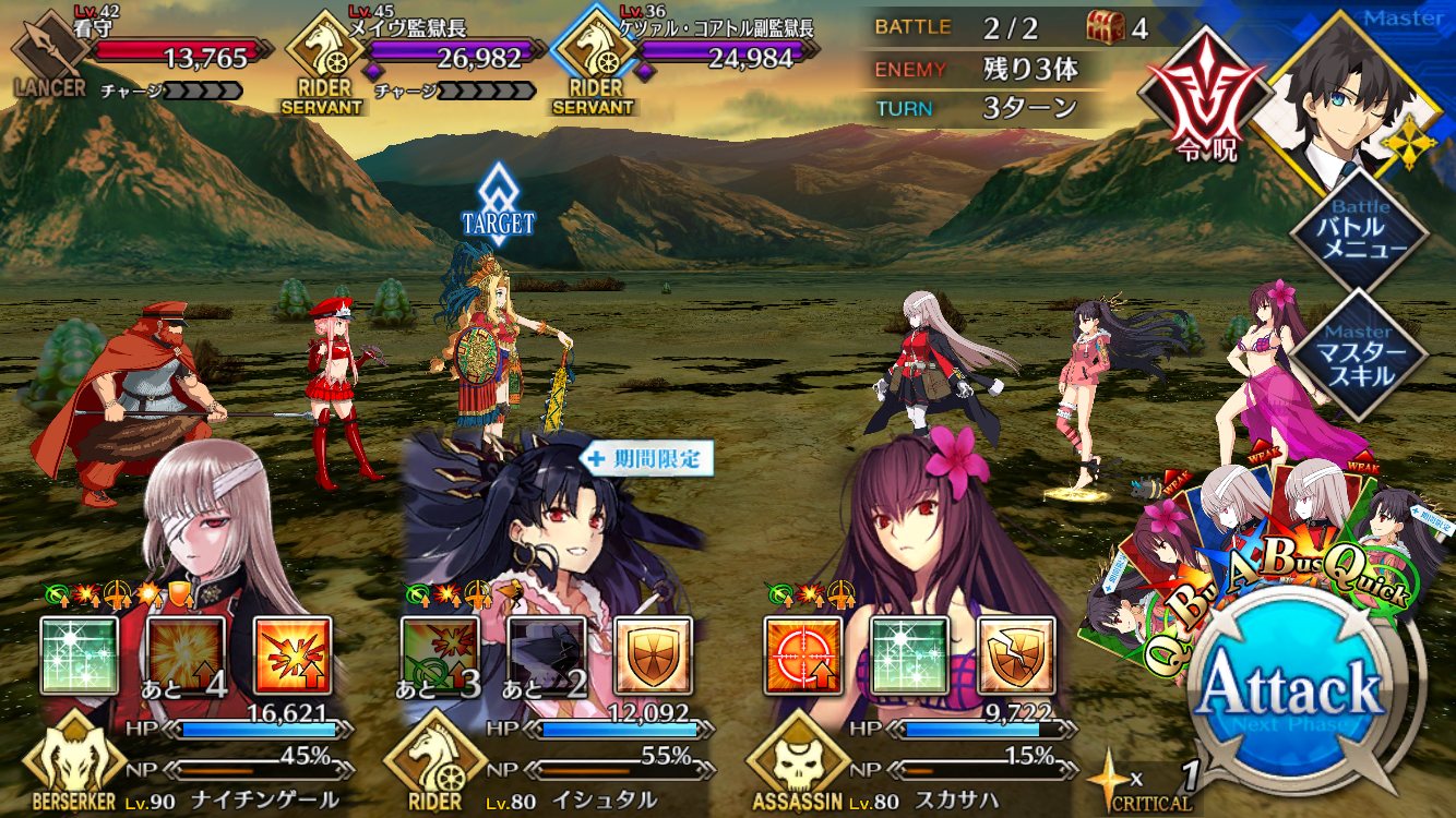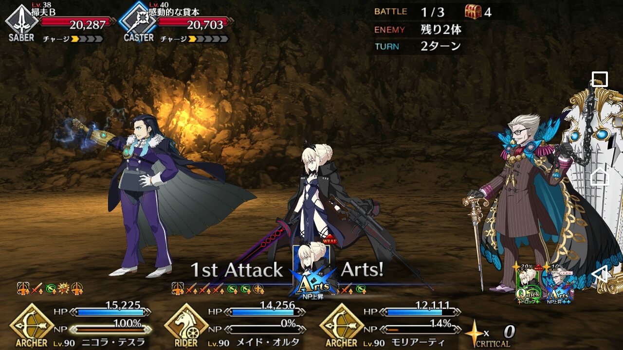 弱体無効張られたけどチャージ系のスキルは無かったし剣で固めるか孔明マーリンで剣を補助するかすればすんなりと行けると思う。ただ完全なる形を乱発されることがあるのでそこは注意アプリ落ちを防ぐために敵味方合わせて宝具縛りプレイしなきゃいけなくなるとは…
