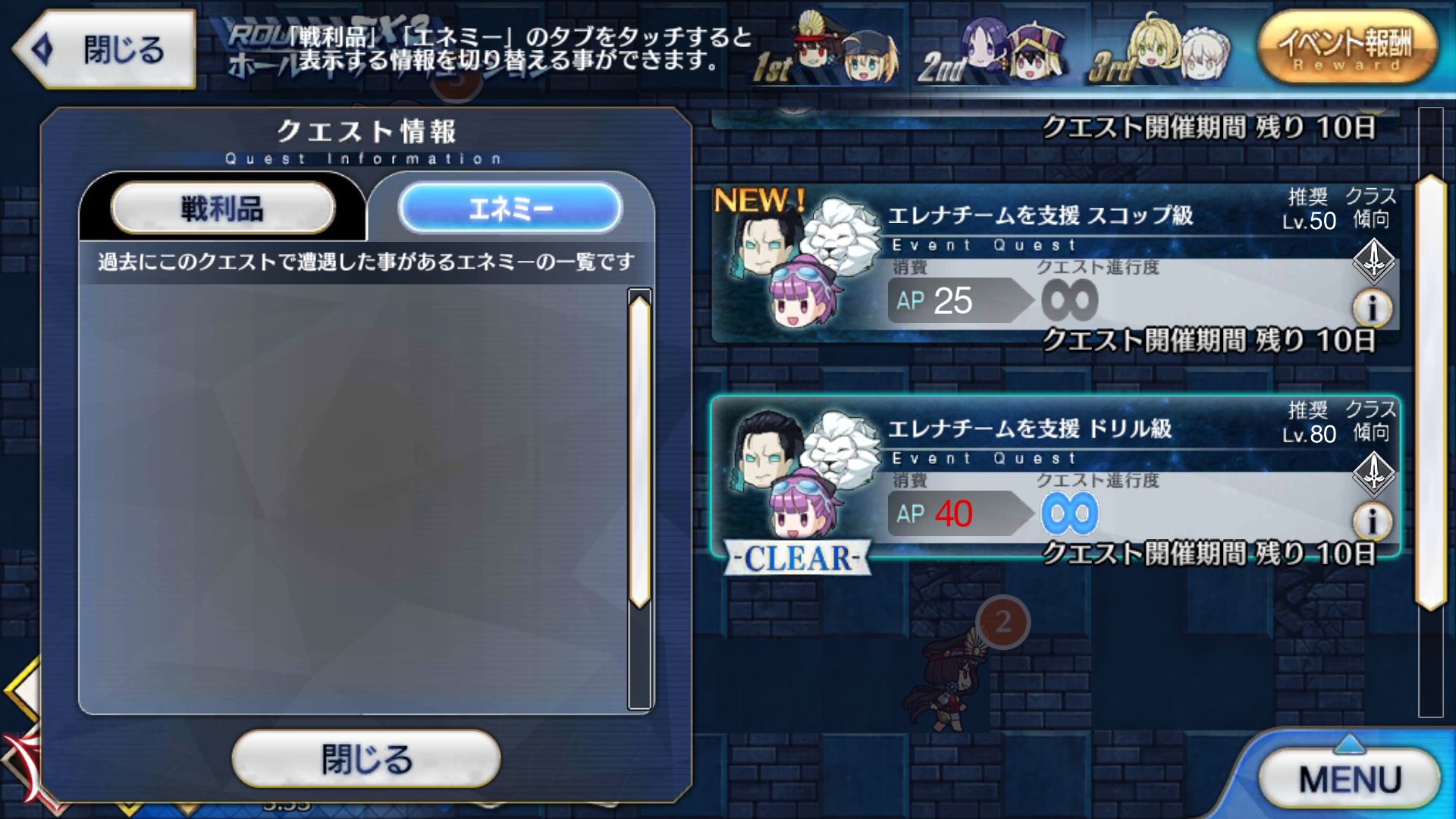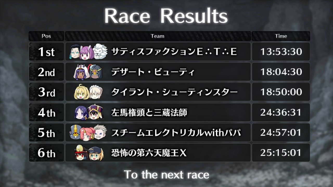 6位 フラン&バベ 25:52:12 14:25:14 24:43:30 24:57:01 199:33:01メイヴちゃんが宝具撃つとアプリが落ちるから先に進めねえ!