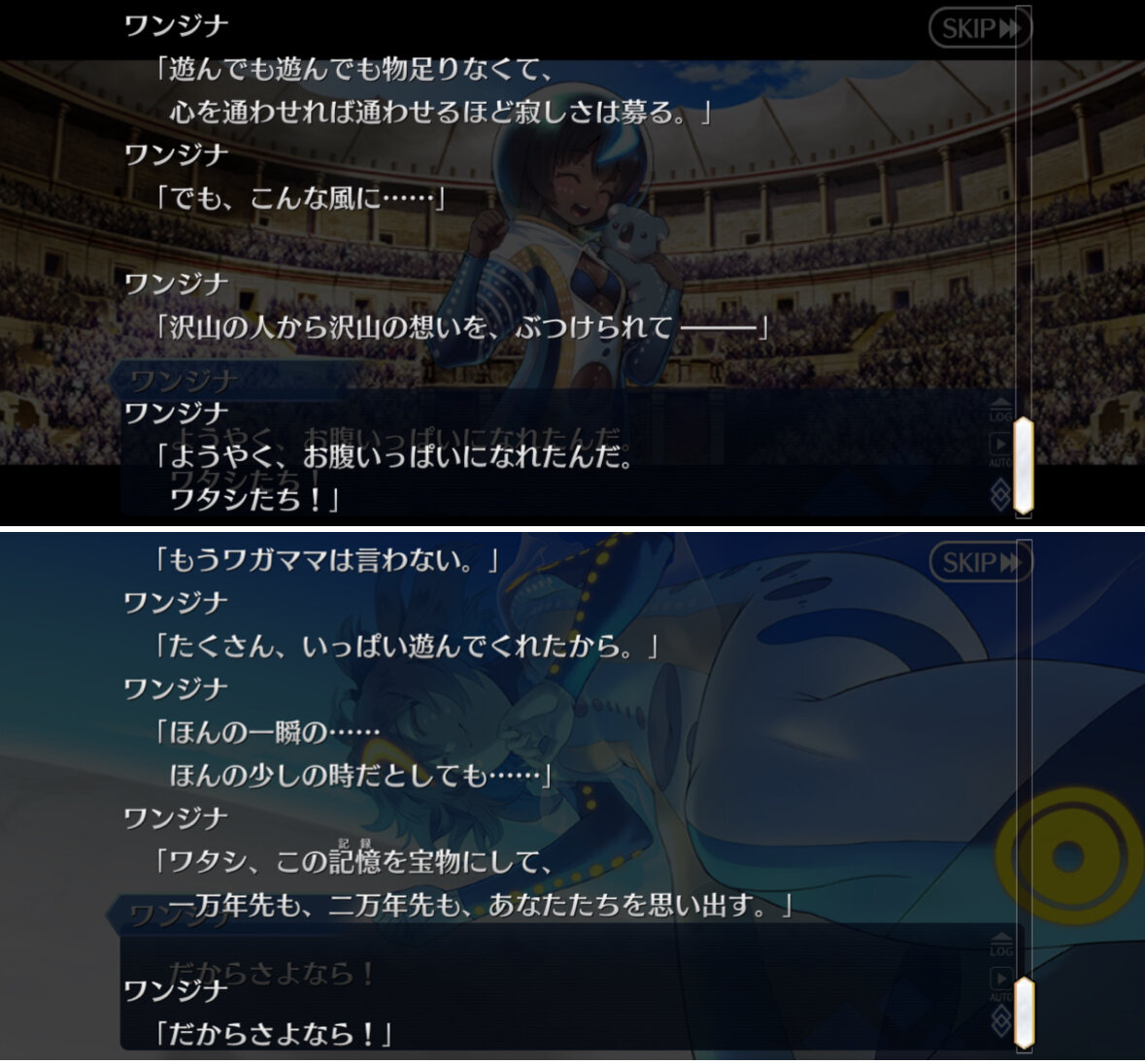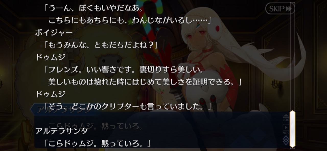 それにワンジナちゃんは自分だけでなくマスターが楽しんでないことが気掛かりだったことが分かって、サバフェスのときと何も変わってない『皆が仲良く、そして楽しむこと』を良しとするワンジナちゃん何も変わってないんだと安心したわ。聖杯に足生えてないか身構えちゃったよ