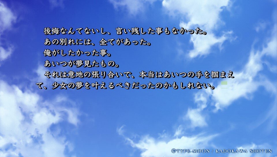 個人的に面白いのはさ、衛宮士郎は「近代文学的に複雑な人間心理」を抱えた「仁義八行の怪物」ってところ。きのこは士郎の「正義の味方」への憧れを「精神病理」として批判的に描写したうえで、その生き様の持つ尊さや美しさもまた「間違いなんかじゃない」と肯定してみせたこと。これは、伝奇作家であるきのこが、古典的な伝奇文学と近代文学の成果を見事に融合して昇華した、エンタメ文学史上でも特筆すべきことのように俺は思うんだよね。……大袈裟かもしれんが。俺は士郎が好きだ。型月キャラの中で一番好きだ。不器用で、他人の好意にも悪意にも鈍感で、頑固で、自分のことを勘定に入れられなくて、でも誠実でまっすぐで、根っからのお人好しで、朗らかになんかめったに笑わないけど、その分心の底から笑顔になった時の顔がすごく素敵な、そんなアイツが好きだ。幸せになっていいんだってことを、じっくりしっかり知ってほしい。そして願わくば、素敵な人と結ばれてほしい。Fateルートの彼にはどうか、星を追うのをやめないでほしい。UBWルートの彼には、どうか信じた道を守り通してほしい。HFルートの彼には、桜と一緒に、ささやかな幸福をかみしめてほしい。