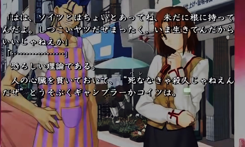 ただ、「他人の幸福」にしか歓びを見出だせない。大切なもののなかに自分を勘定に入れていないし、入れることを許せない。そして、「誰かを助ける」という目的のためなら余計な感情を排除して機械的に振る舞える。……ただ、それだけ。それだけなんだが、その一点があまりに極まりすぎて致命的なレベルの破綻をきたすリスクを抱えた、見えざる爆弾なんだよな。