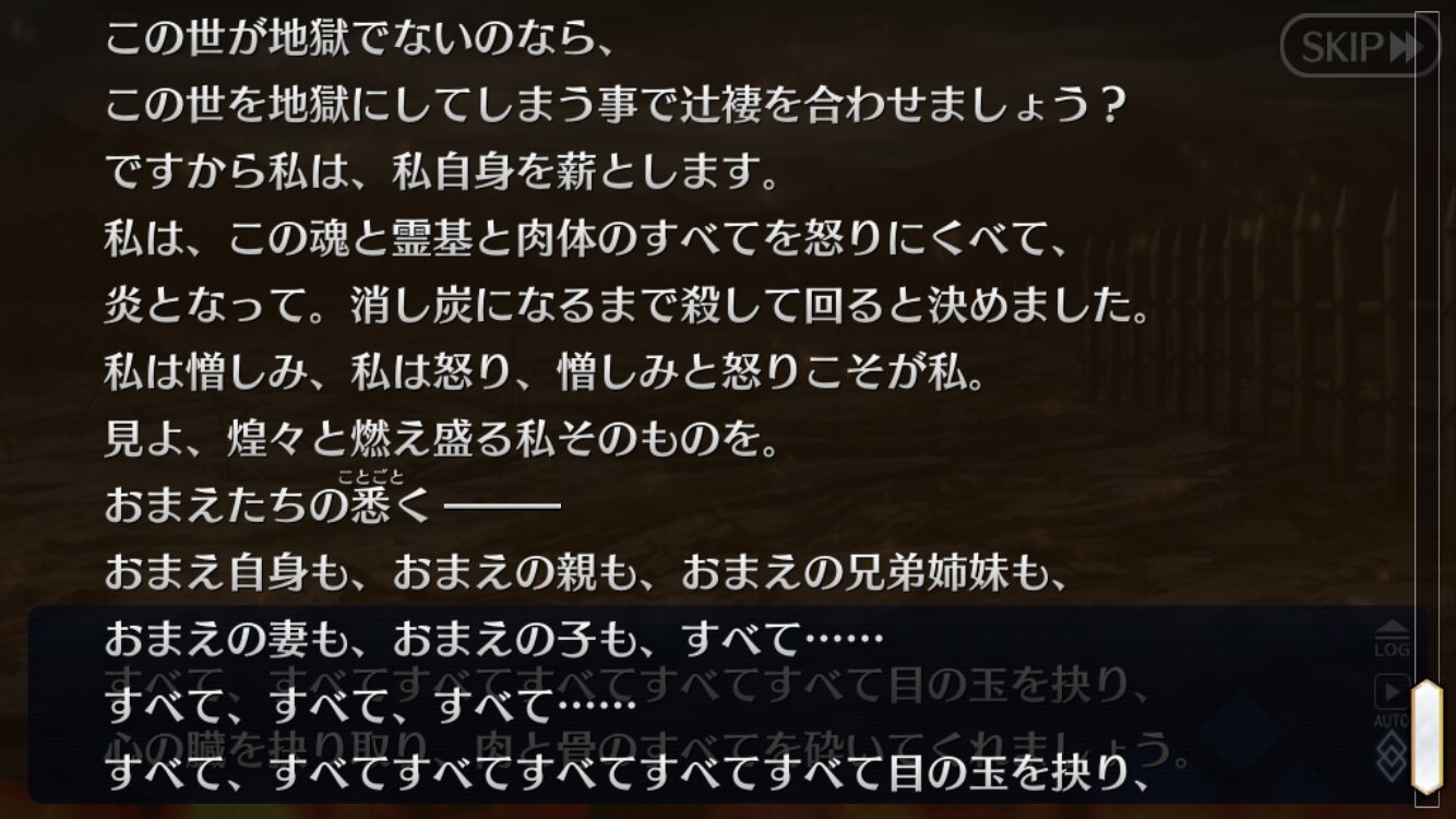 スサノオのヤマタノオロチ退治もヤマトタケルの征服も小規模ながら世界破壊って扱いになるのかもしれん無敵の返しと言うか丑御前にとっては嘘偽りなく魂を捧げるレベルで共感してマスターの指示に従ってるだけだからなあ