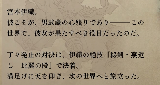 ジュナが共感してたのもその二面性の強さからだろうしセイバーに負けた原因を考えても余分があるから道を極められないってのもまた違うのがもどかしい男武蔵の心残りが女武蔵を呼んだ…ってのは分かるんだけど、何がしてほしかったのかな?