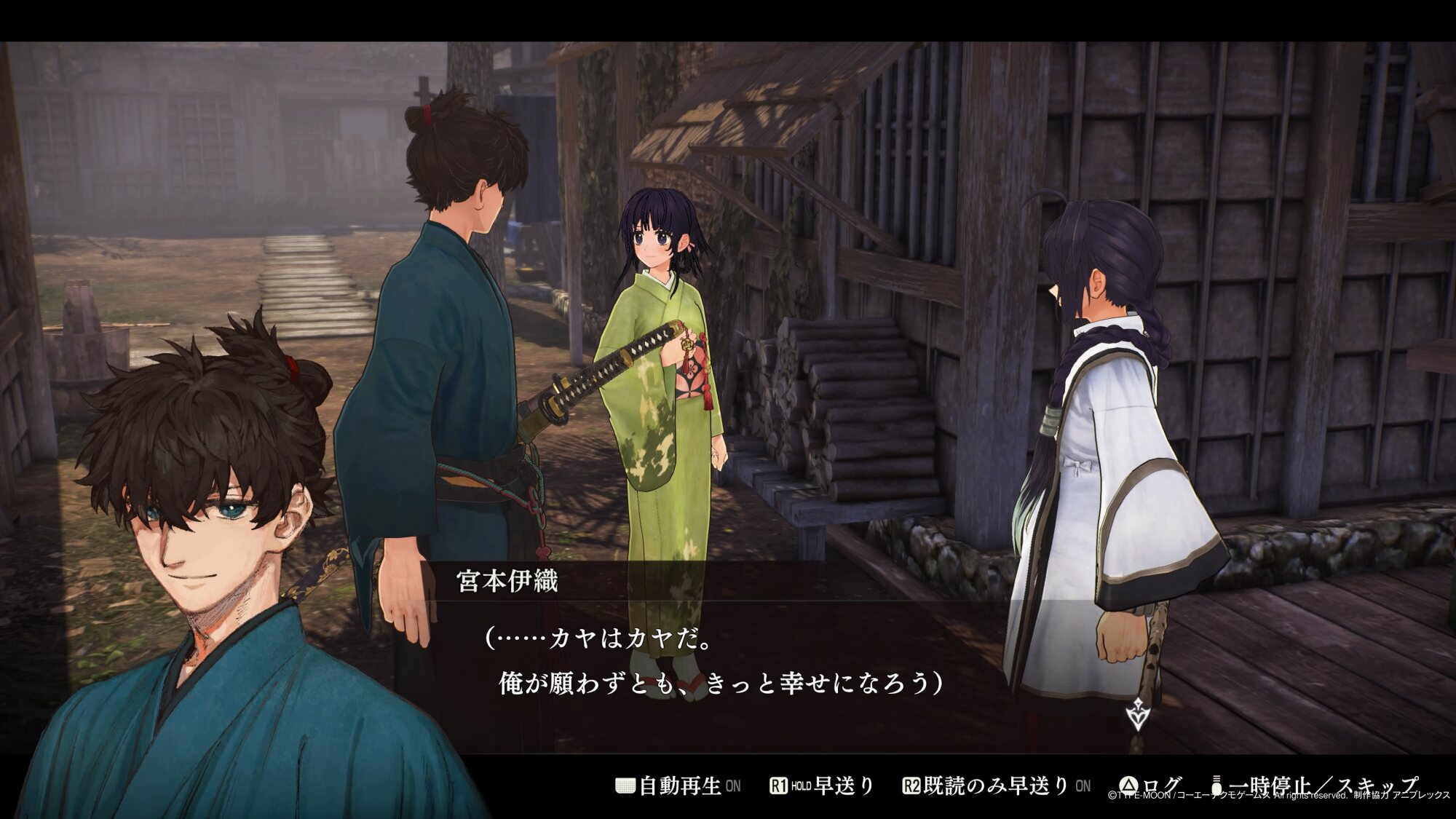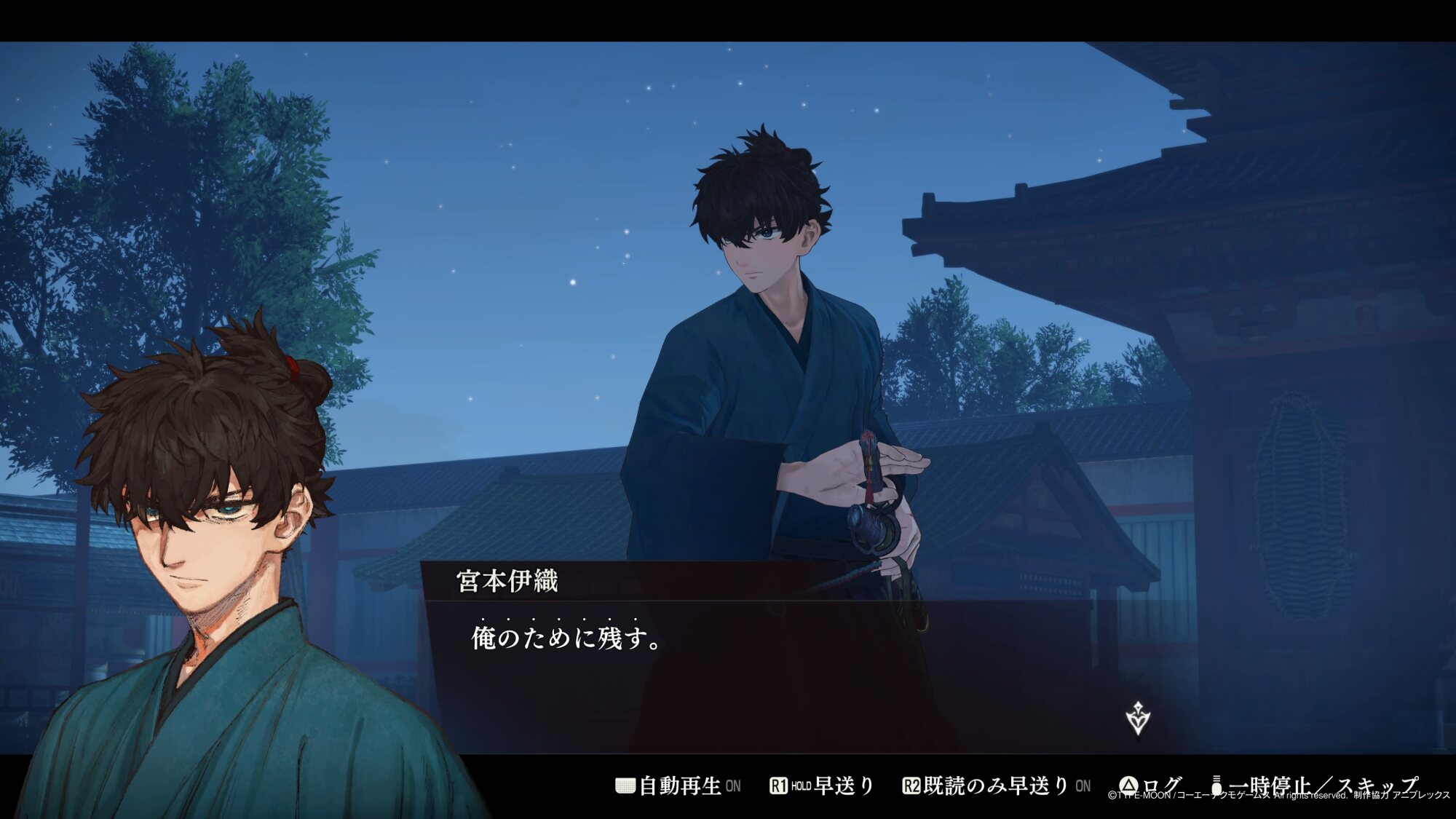 (「月のような剣をみました」、「俺は師匠の二天一流で、あの夜の剣を超える」などの伊織の発言。また最も古い記憶のムービー時、剣士の刀が一本?であったこと。)