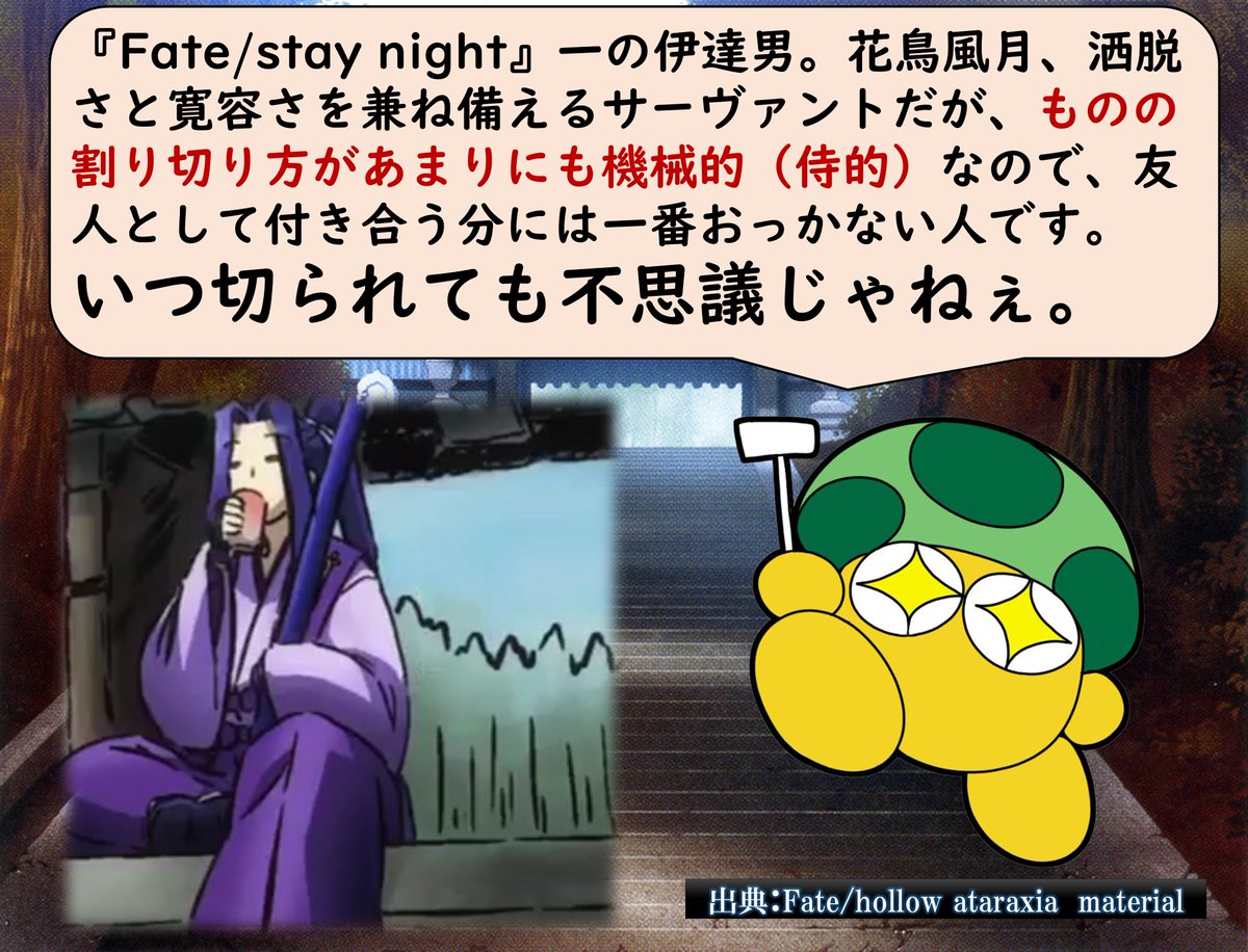 ②一条と怨讐では友人としてあったが「可惜夜に希う」では一人の剣客、剣士として向き合ったのであえて呼ばなかった。伊織くんの中でセイバーが斬る対象になっていたので下手したら名前を呼ぶこと自体「余分」として切り捨ててた可能性あり