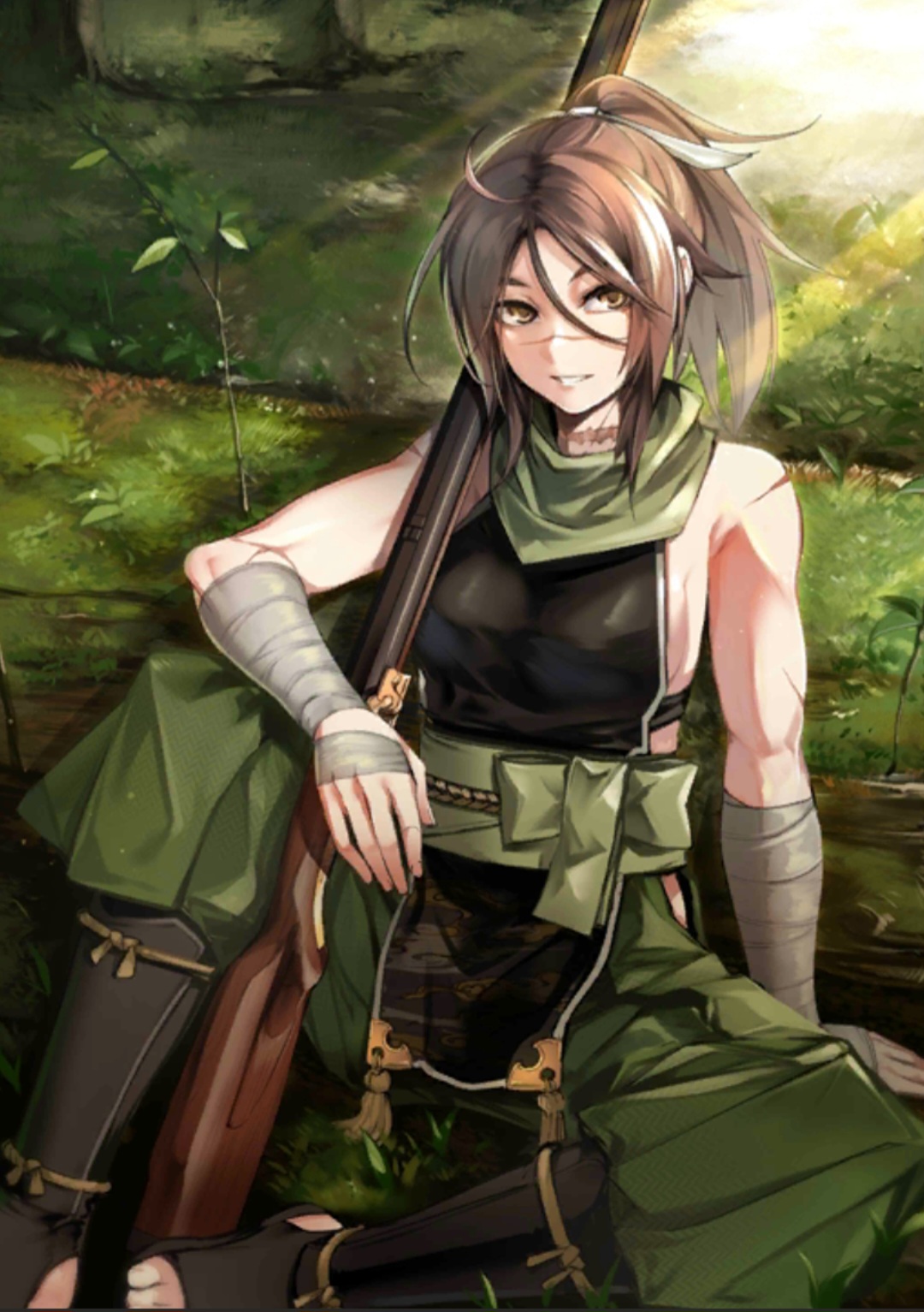 (炸裂する硝煙の香り)杉谷さんのでっけぇ乳もいいけど木漏れ日が射した森と背中を預けてる苔むした石畳?の背景がすげぇかっこよくて好き