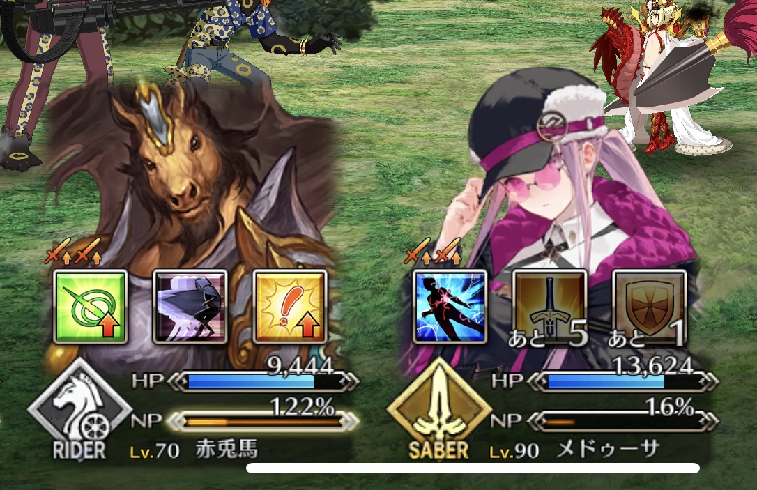 ②↑が引けたら黒王スキル123、光コヤンスキル13、水着クロスキル1、黒王にメジェドの眼⇒黒王でどれか1体にアタック後黒王宝具