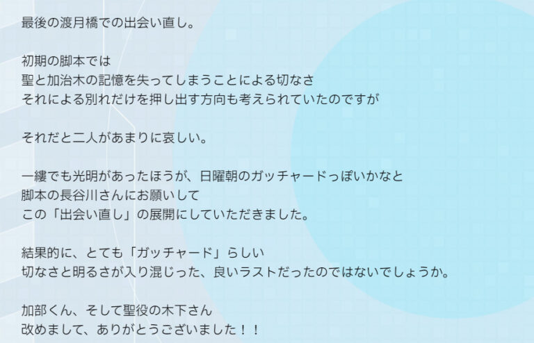 本来はお別れしてさよならだったけどそれじゃあんまりだろって事で運命の出会いもう一度にしたみたいだね>>97