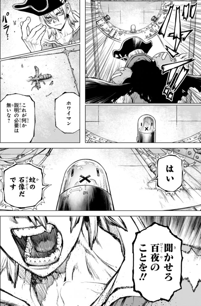 あれは、蚊の石化は目的じゃなくて副作用で、「関東一円をカバーするだけの石化光線を出した」+「龍水は、ホワイマンに詰め寄る時に、蚊と一緒に百夜のことを聞いている」=石化ビームで送られてきたメッセージは、ホワイマンによる自演って感じじゃないかなと>>79