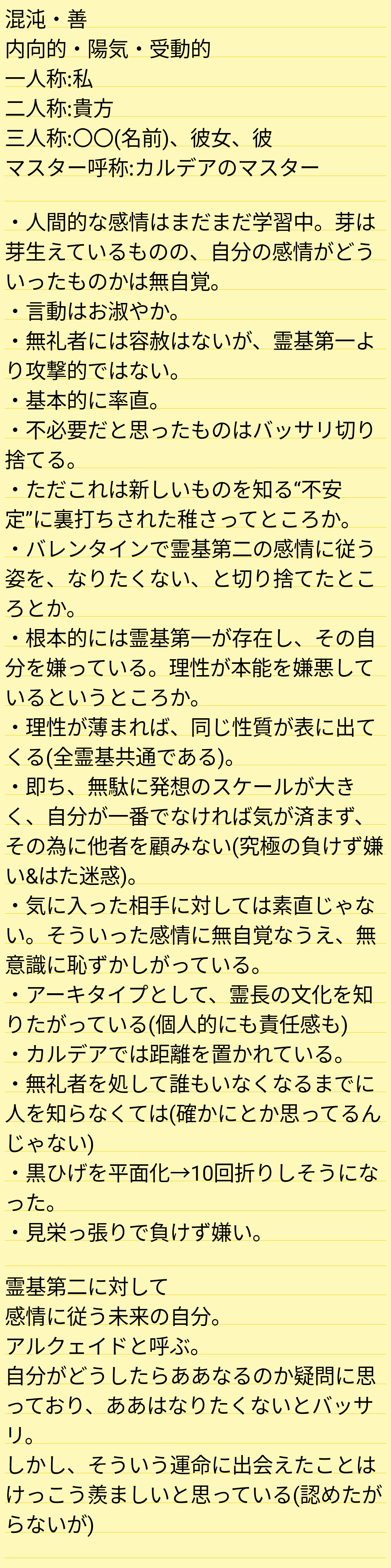 アルキャスだったら卑屈さ故に足踏みしちゃうような場面でも開き直ってというか悪びれなく実行しちゃうタイプ。アルトリア方面で頭妖精、かつ仕事モードだとシステム的な側面が強くなる。>>76
