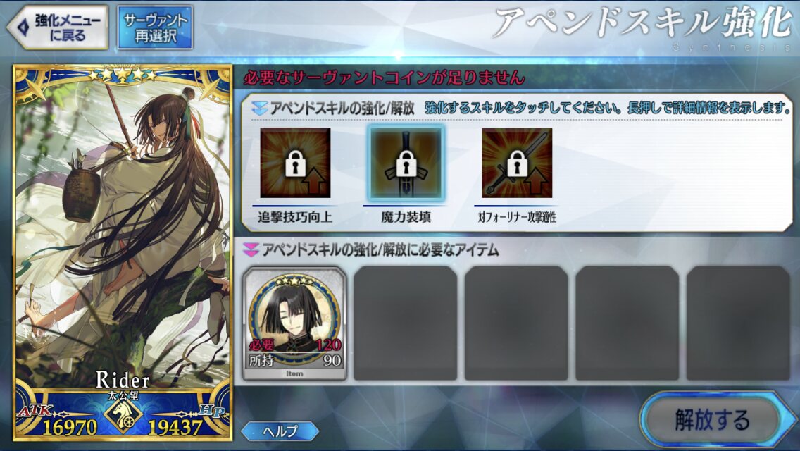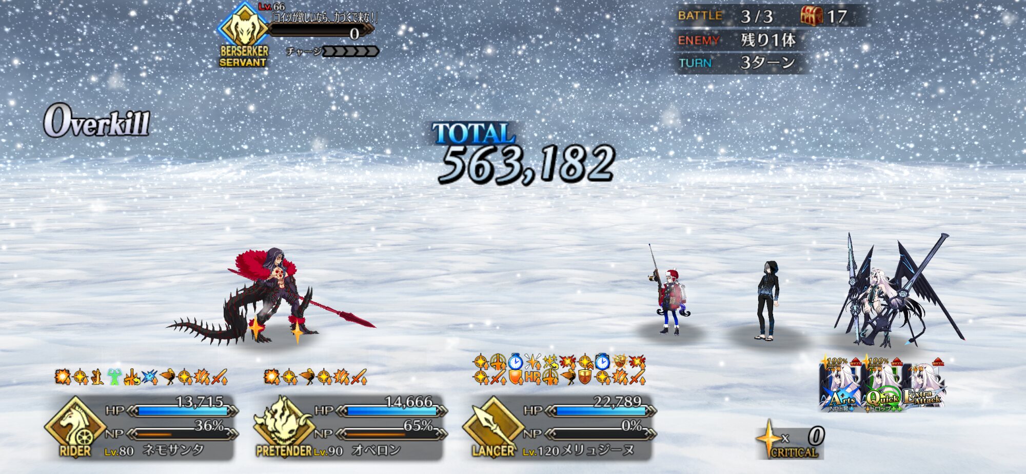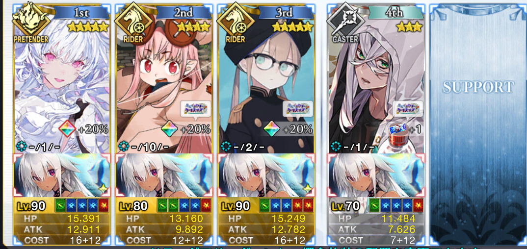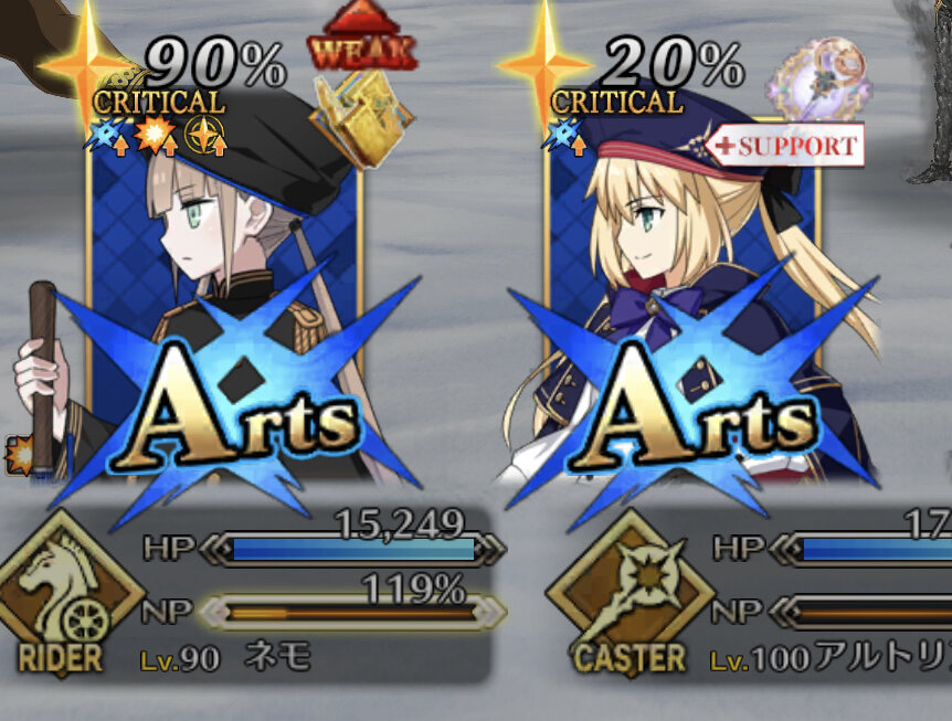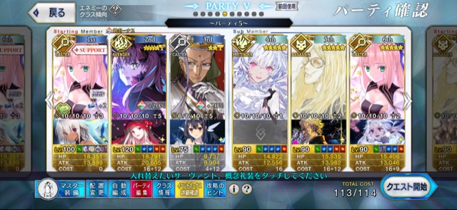 ガッツが面倒だったもので……。90++のアタッカーに⭐︎5ネモ、バッファーに徐福ちゃんとオベロン起用してみたけど、バフ足りなくてネモの宝具3は欲しいかも