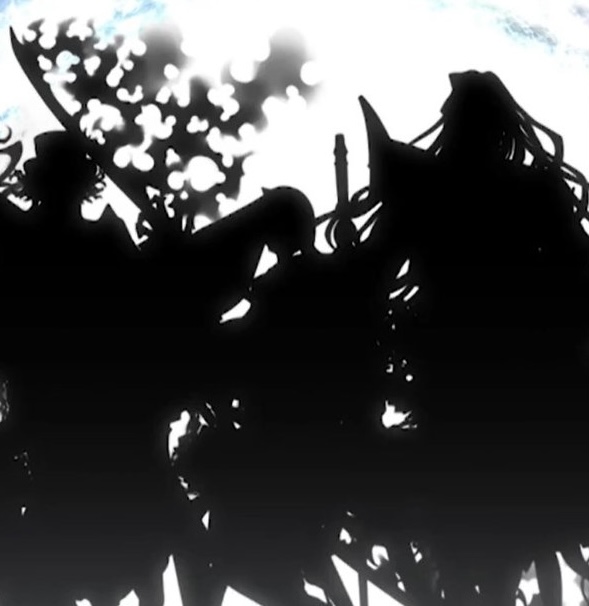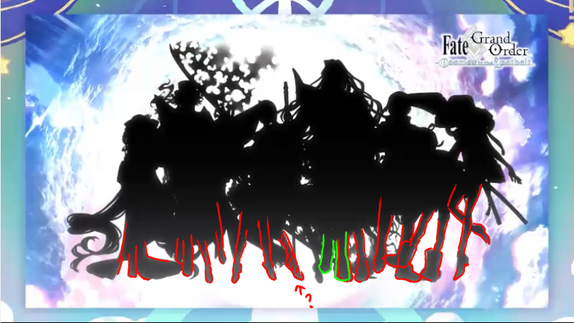 沖田さんはぐだぐだの設定的に平行世界の存在だから別枠定期シルエットの長い武器に炎まとったやつ、その右下にももう一本あって、どうみても1人で持てる位置にはないから2人1組かも