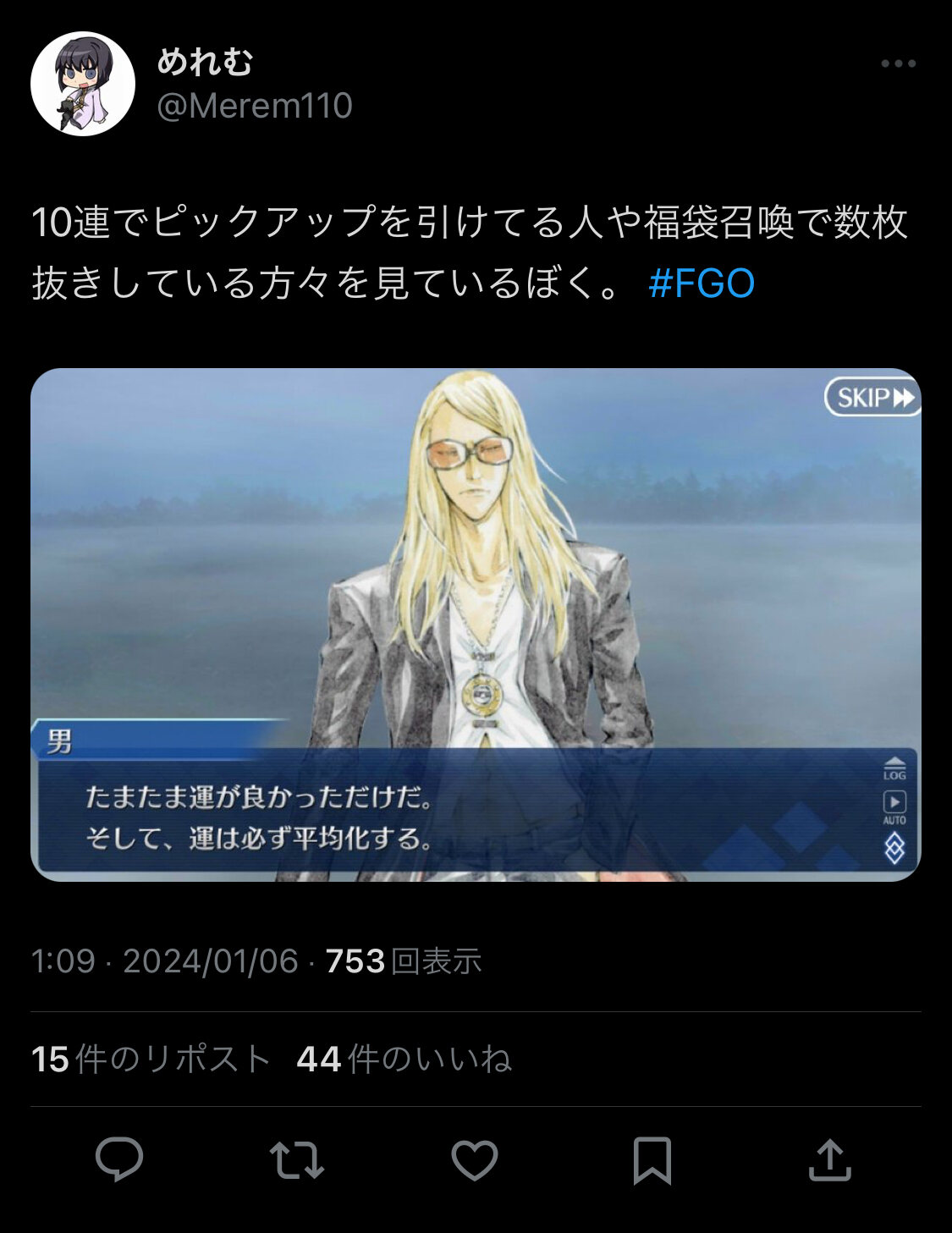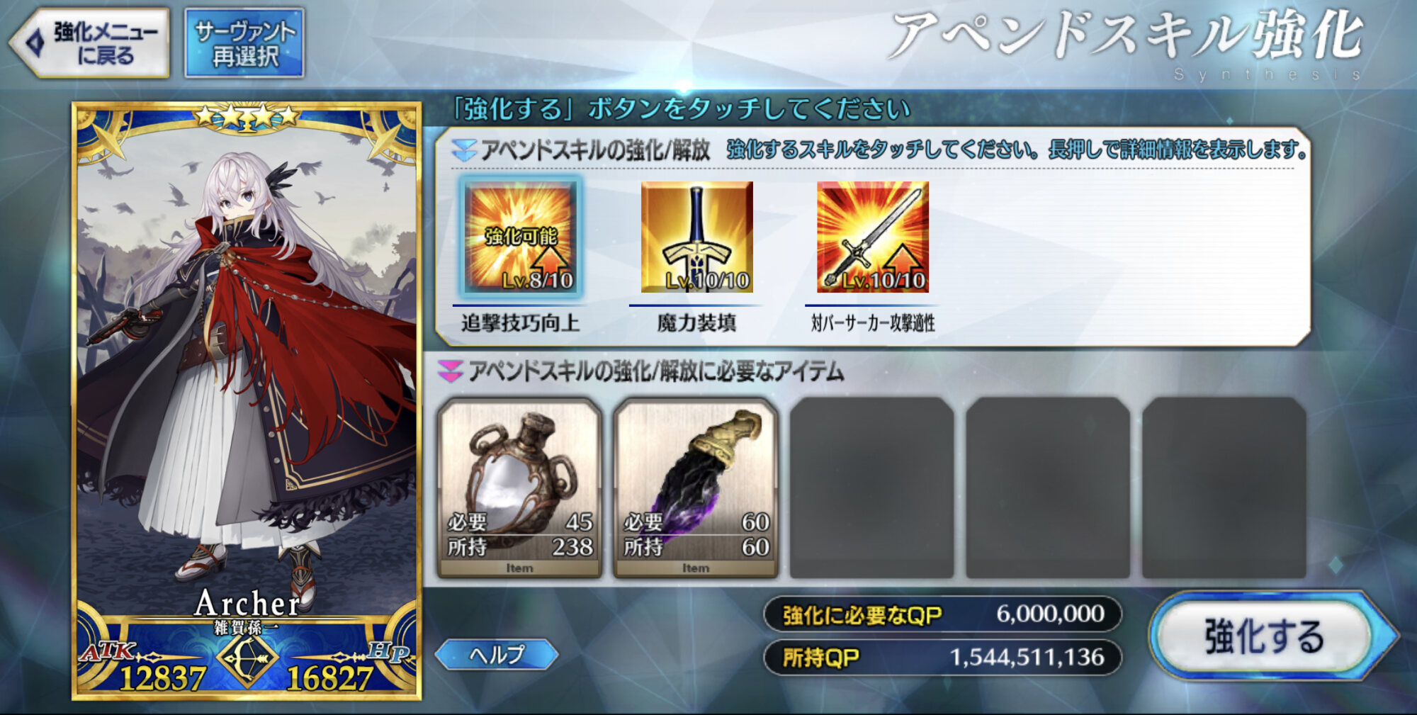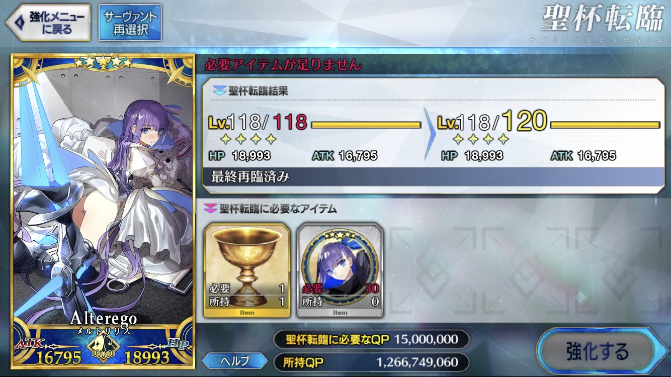 まぁ蛍に使うのアペンドだから再臨とスキルに使うテスカトリポカに比べたらアペンド2に使う分以外は後回しにしてもいい感じだけどな>>878