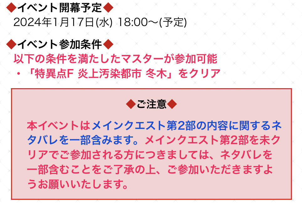 本イベントはメインクエスト第2部の内容に関するネタバレを一部含みます。メインクエスト第2部を未クリアでご参加される方につきましては、ネタバレを一部含むことをご了承の上、ご参加いただきますようお願いいたします。