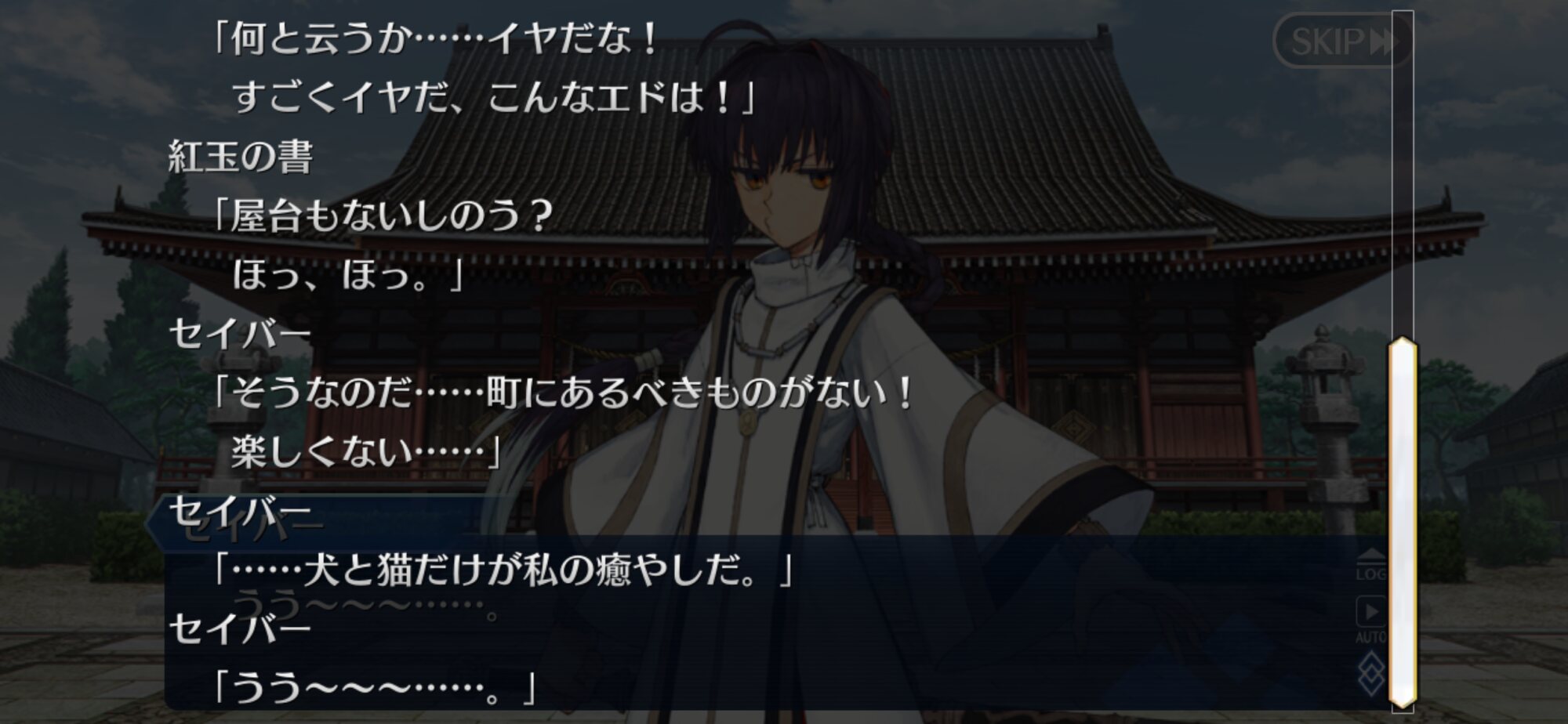イオリがどういう奴なのか分かってて、そうしないと生きていけない奴なのが分かってて。普通なのを望むだろうか。どのルートであっても、セイバーは一番の理解者で、●だったと思う。自分の願いを放り出すくらいなのに。頭突きしに来たのだと思いたい>>54
