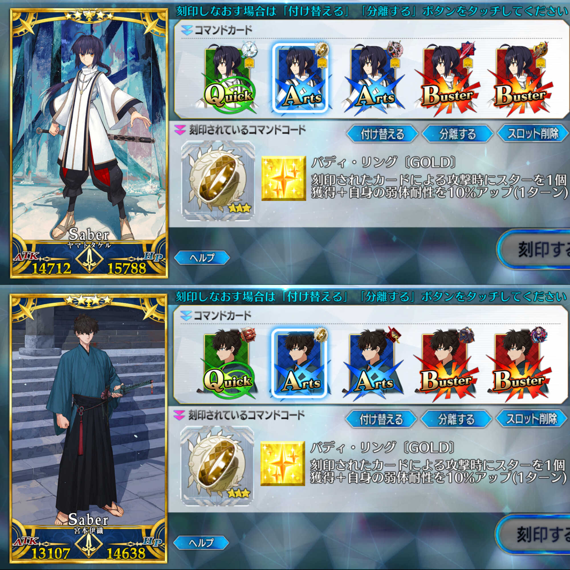 弱体付与成功率アップ、いまだに能動的に味方へ付与できるの術ギルしかいないんだよな……オベロンは控えに行くと効果消えるし。術ギルとノクナレアは同じA宝具同士で向こうはNP50%持ち(アペンド込みなら70%)で即宝具が狙える、ノクナレアは足りない攻撃バフをもらえると相性もいいという。>>912