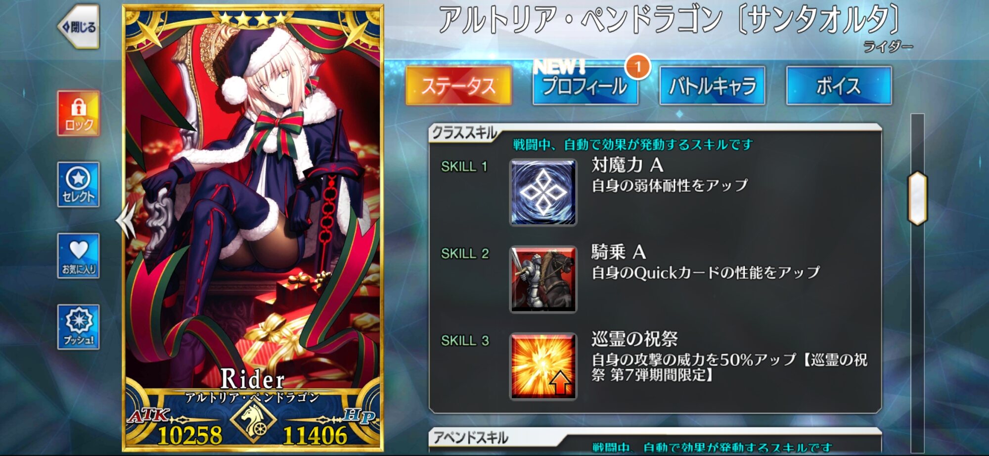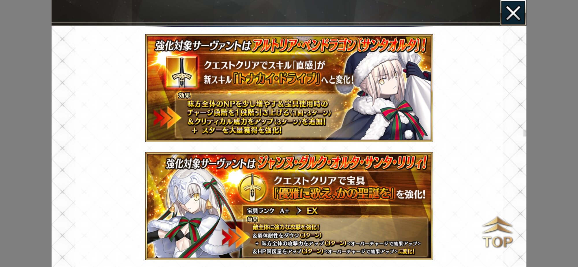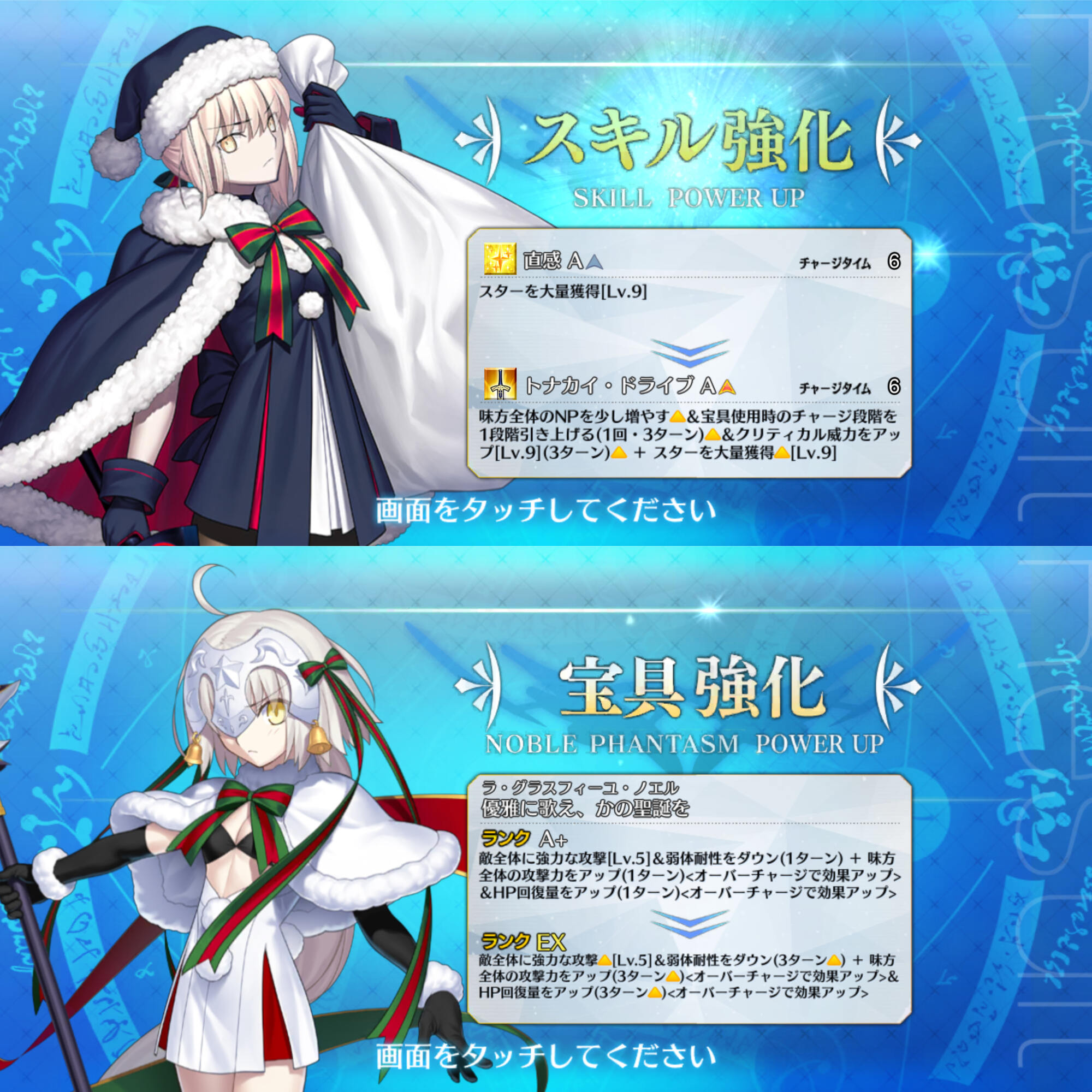 今回はアルトリアサンタとジャンヌ・オルタ・サンタ・リリィが強化‼ 二人ともサポート能力が強化され、パーティの底上げが可能となりました‼ 味方を強化するのはいかにもサンタさんって感じですね‼