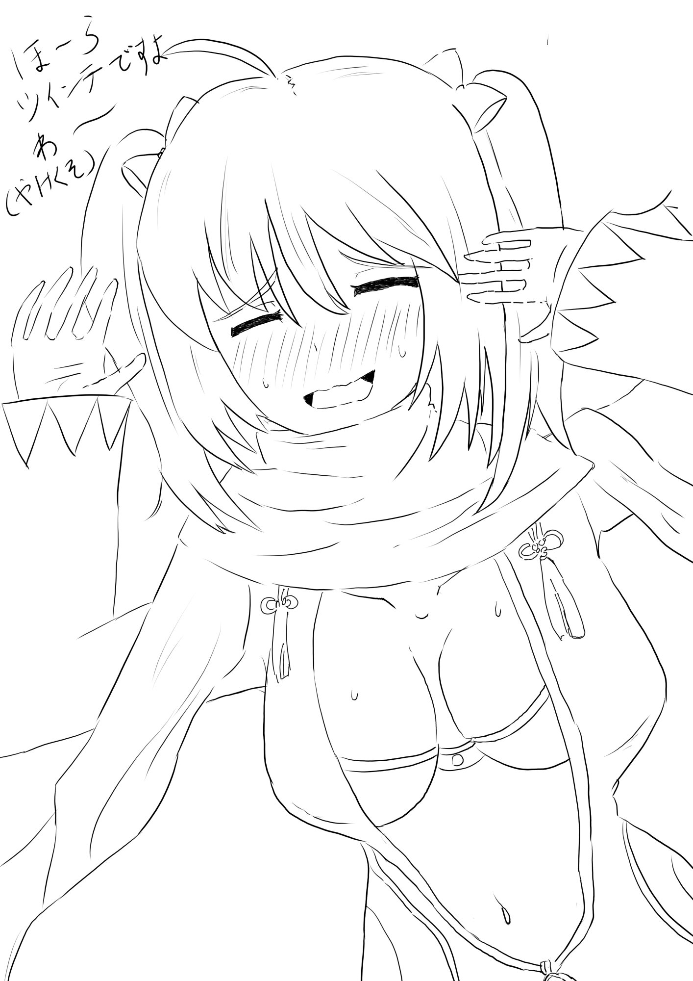 見えますでしょうかこのふにゃふにゃのご尊顔とお口、もうやけくそで頑張って笑顔になってるのがよく分かりますね!!!ツインテは恥ずかしい物という知識をしっかり持った上でマスターの為にしているのがよく分かります、胸が躍りますね水着沖田さんのえっろほんと豊かに実った稲穂かな。向かって右の口角が引き攣るように上がっているのも無理してる感があって大変えっちさと可愛さを両立しています沖田さんは享年24〜26歳なのでこのちょっとツインテールをするにはいい加減恥ずかしい歳なのではというのを自覚しつつ、それでも顔を隠したいけどせっかくしたからにはマスターに見て欲しいけど恥ずかしいという気持ちがこの定まらない両腕に現れておられるよう私は感じました。