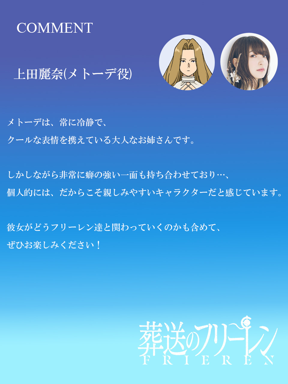上田麗奈さんの演じる綺麗な大人のお姉さん、楽しみ!ザインも友情を一時的に居眠りさせて旅へ同行していればメトーデにも出会えたのにな!>>964