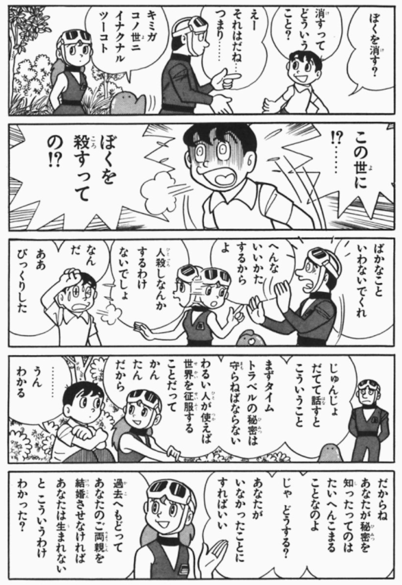 のび太が静香ちゃんと結婚しても、その子供がジャイ子の子供と結婚すれば遺伝子上のタイムパラドックスは起きないと言われてたな。>>68